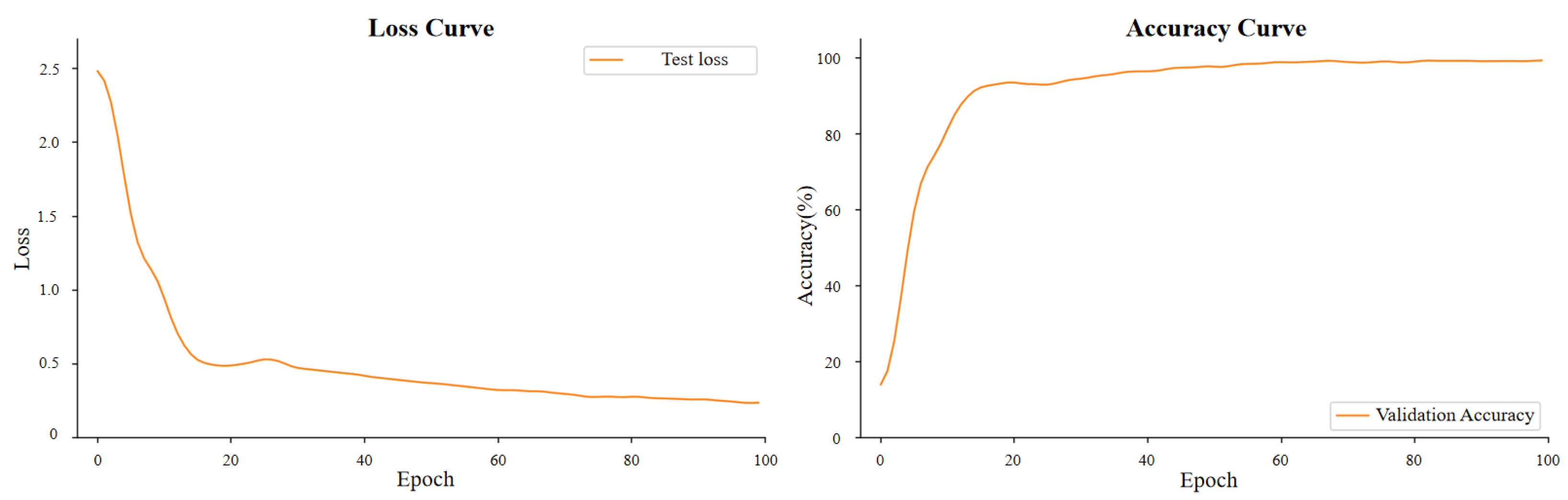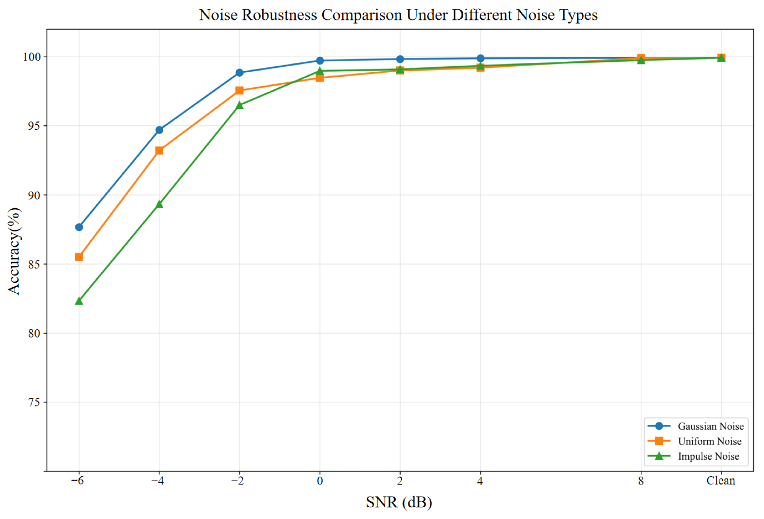 Contrastive loss weight (): This value provides sufficient regularization to enhance inter-class separability without dominating the cross-entropy loss. When , training becomes unstable due to the competing gradients between classification and contrastive objectives. When , the contrastive regularization effect is negligible, resulting in less discriminative feature representations under noise.