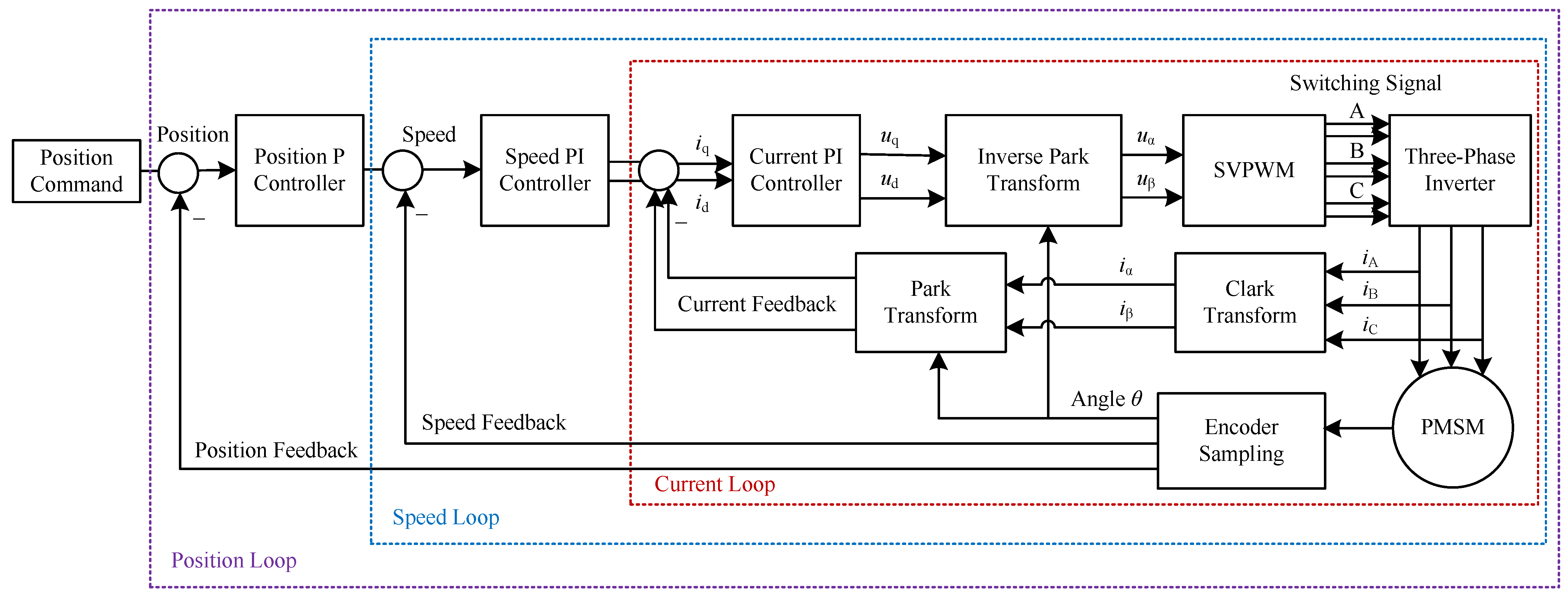 - Mao, S.; Diao, X.; Ding, L. A non-intervention self-tuning method for PI control parameters in a PMSM servo system with three closed loops. IEICE Electron. Express 2025, 22, 20250464. [Google Scholar] [CrossRef]