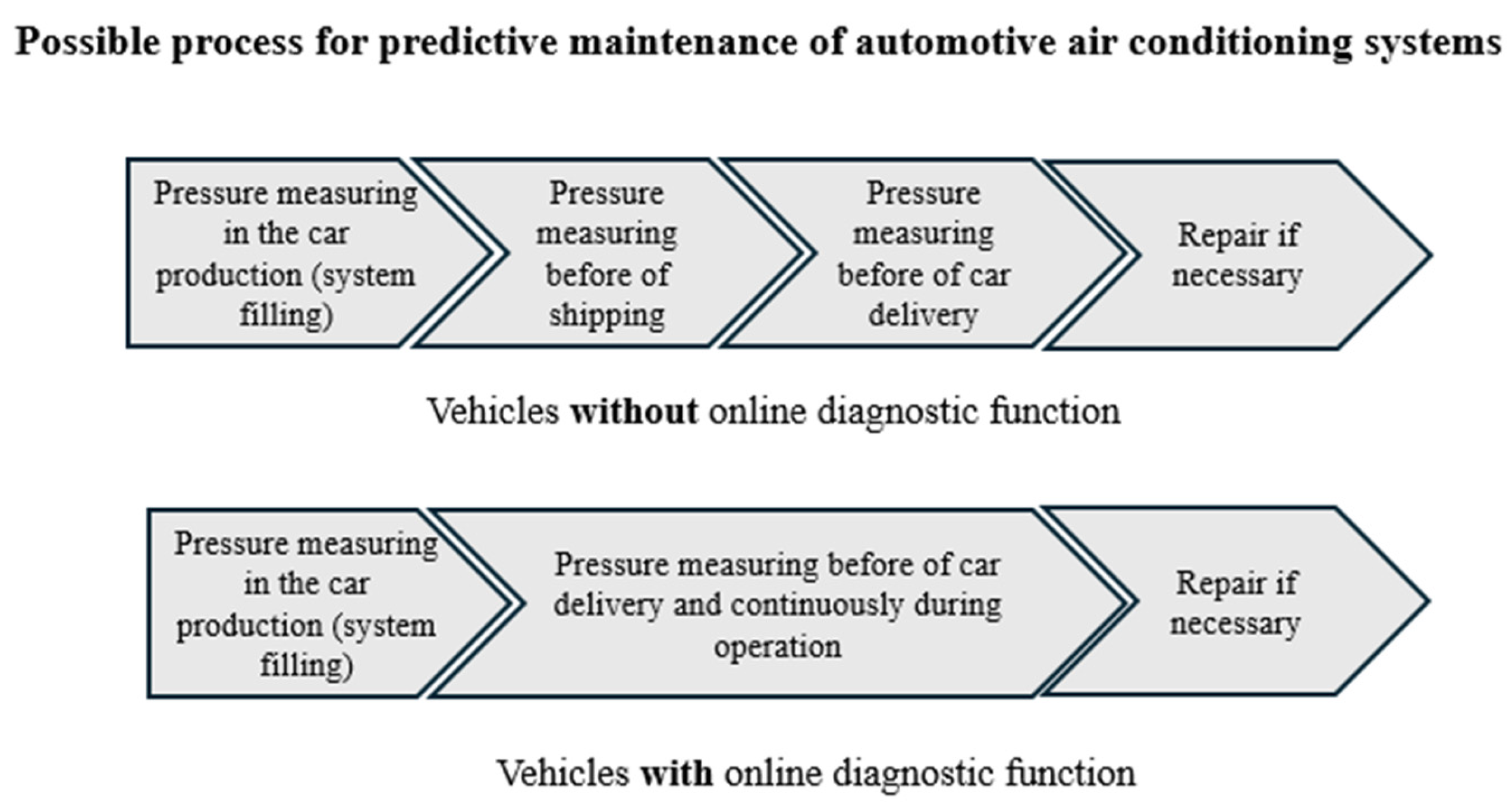 The research showed that it is possible to monitor refrigerant pressure in the air conditioning system in both online and non-online vehicles in the field. This allows us to identify potential micro-leaks, which can be repaired in time within the framework of predictive repair, reducing environmental impact, lowering refilling costs, and increasing customer satisfaction by preventing potential loss of function.