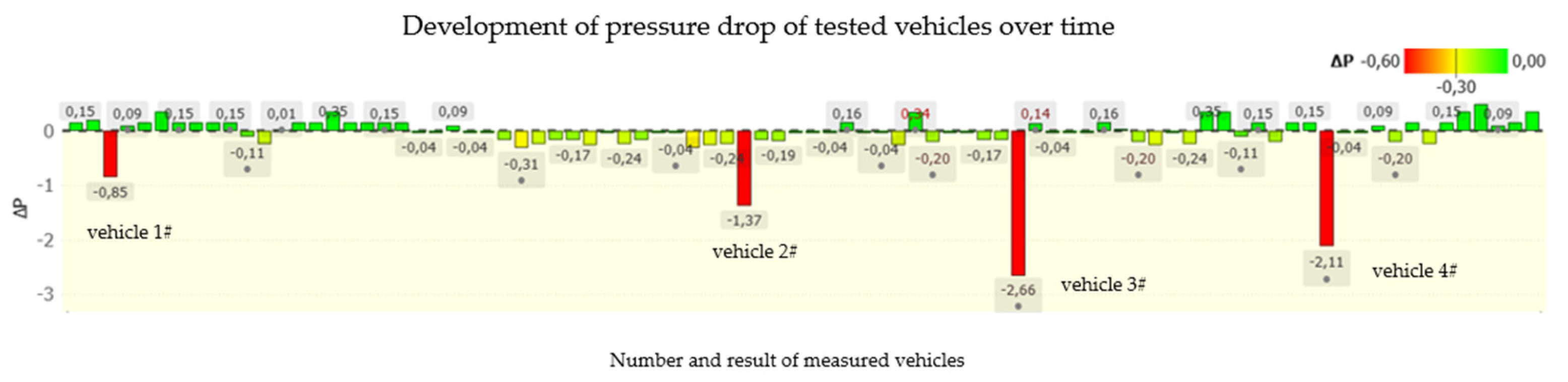 Figure 12). Since the system shuts down to protect the compressor at 1.5 bar, the worst-case pressure loss over the aforementioned 75–105 days is about 4.5 bar, or about 0.06–0.04 bar/day. This is well within the measurement inaccuracy of the vehicle’s sensors. Still, since the control measurement is performed before delivery, i.e., at least 30 days after production, we are already talking about 1.8–1.2 delta p, which is a significant indicator of a leak and is well outside the measurement uncertainty of the vehicle’s control units.