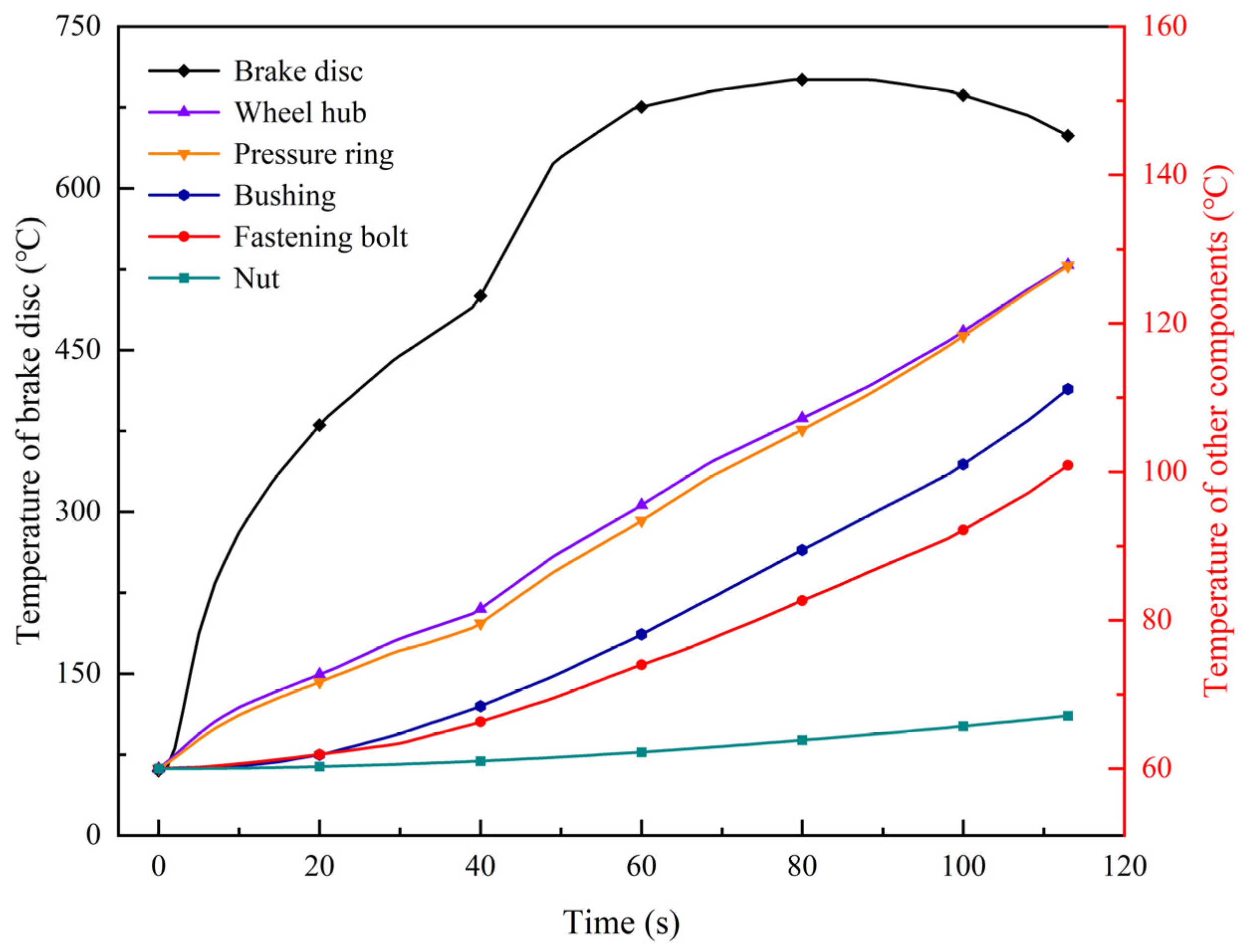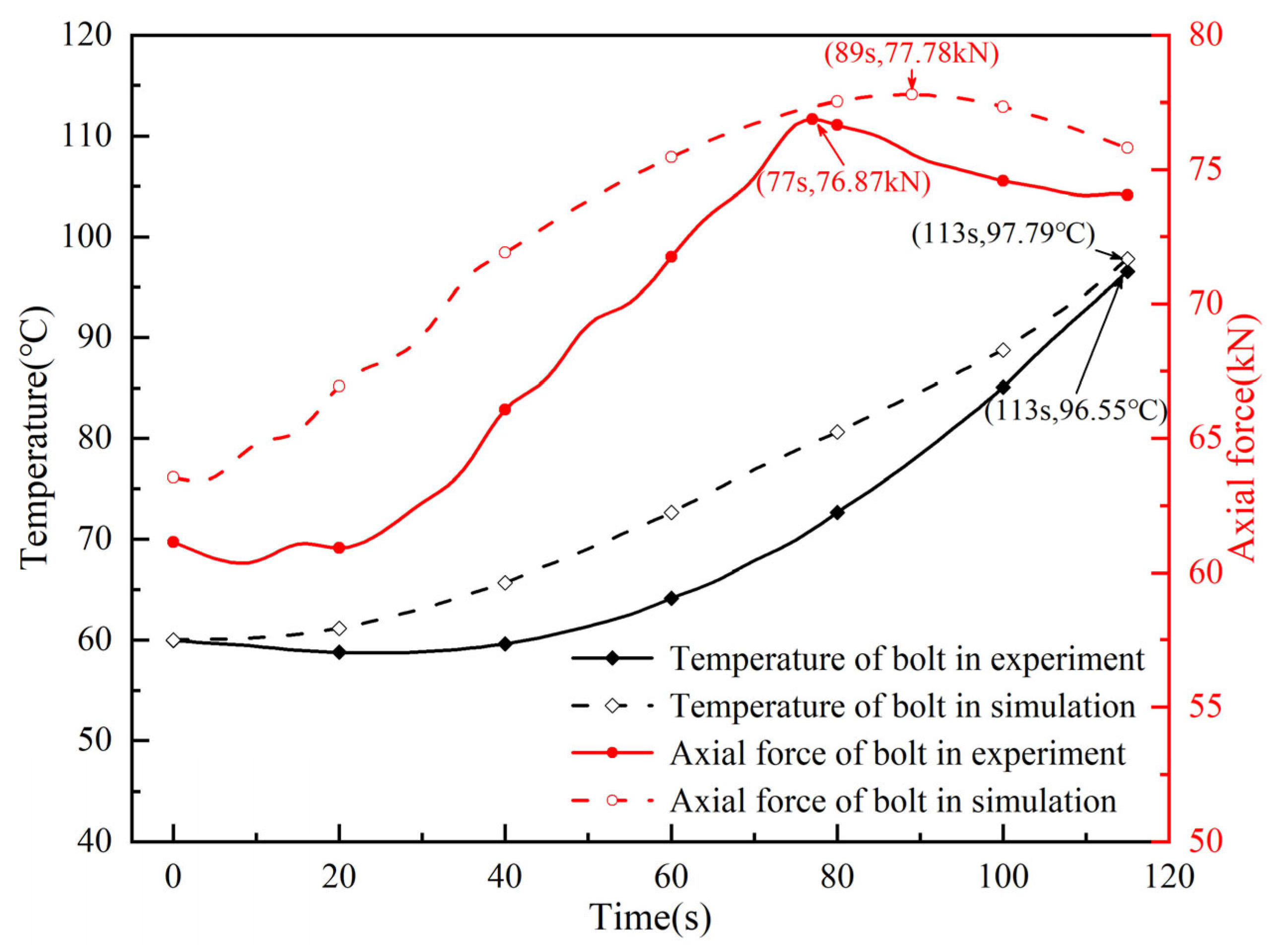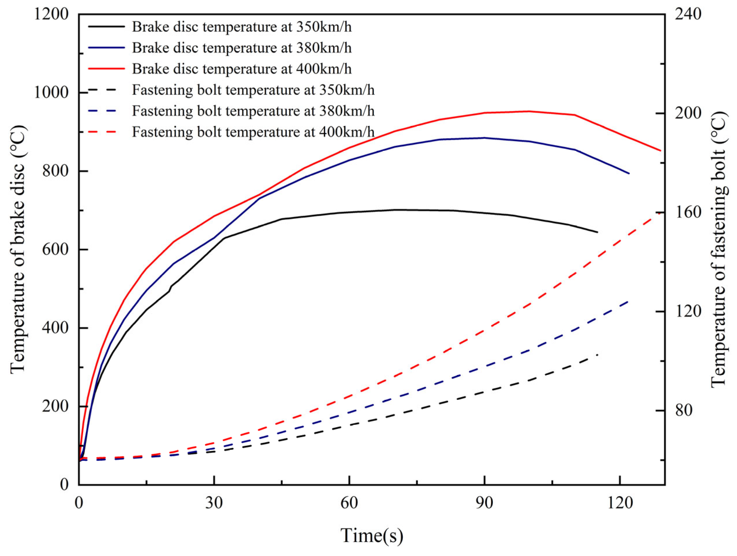 | Disc Temperature (°C) | Bolt Temperature (℃) | Bolt Axial Force (kN) | ||||
