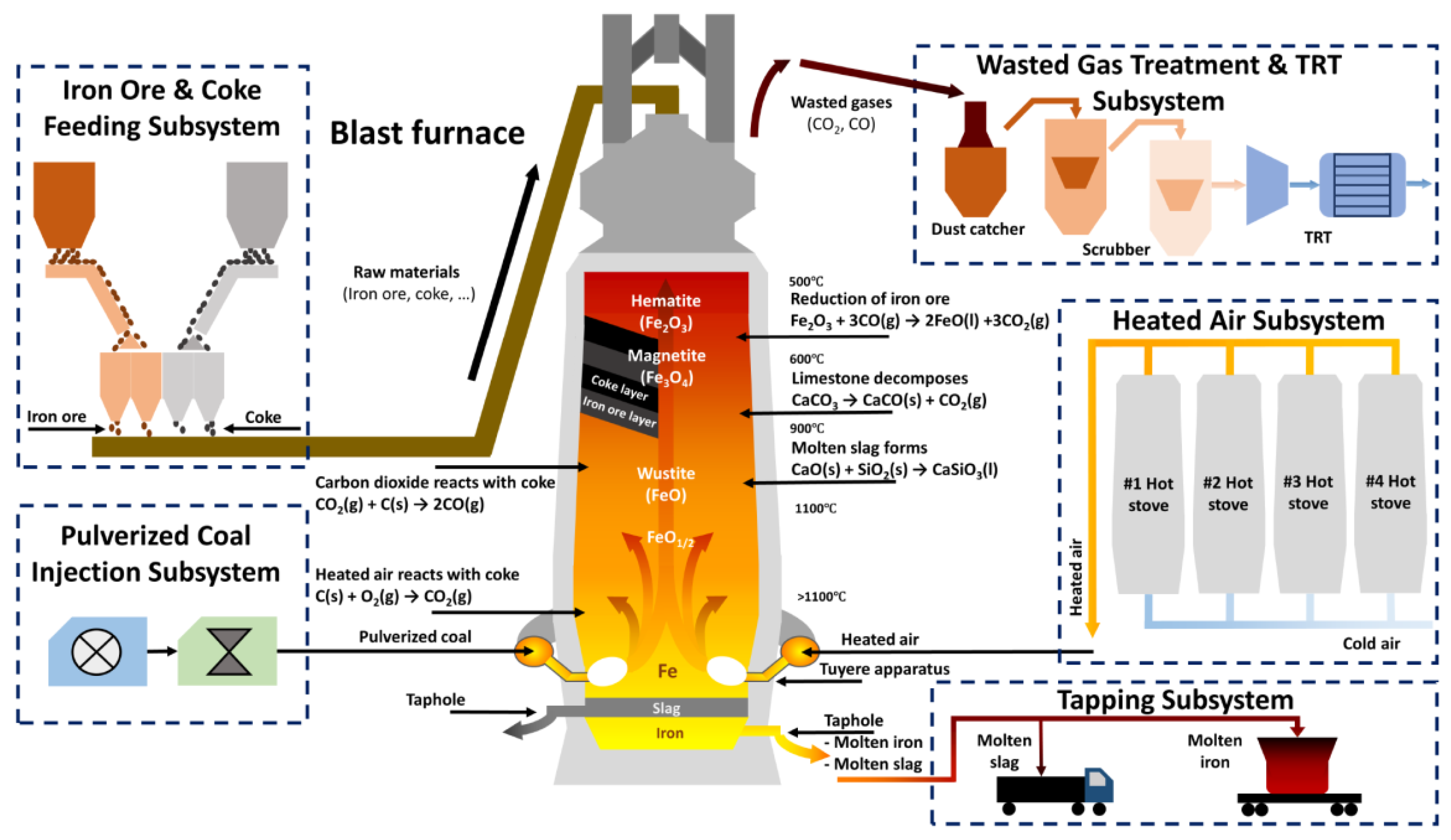 Figure 1. In this process, alternating layers of iron-bearing materials, coke, and flux are continuously charged from the furnace top, while preheated blast air, often enriched with oxygen and auxiliary fuels, is injected through tuyeres located near the furnace hearth. As the burden descends, the iron oxides are progressively reduced by ascending reducing gases generated from coke gasification, forming molten iron and slag. The molten iron collects in the hearth and is periodically tapped, whereas top gas is recycled after dust removal and heat recovery [