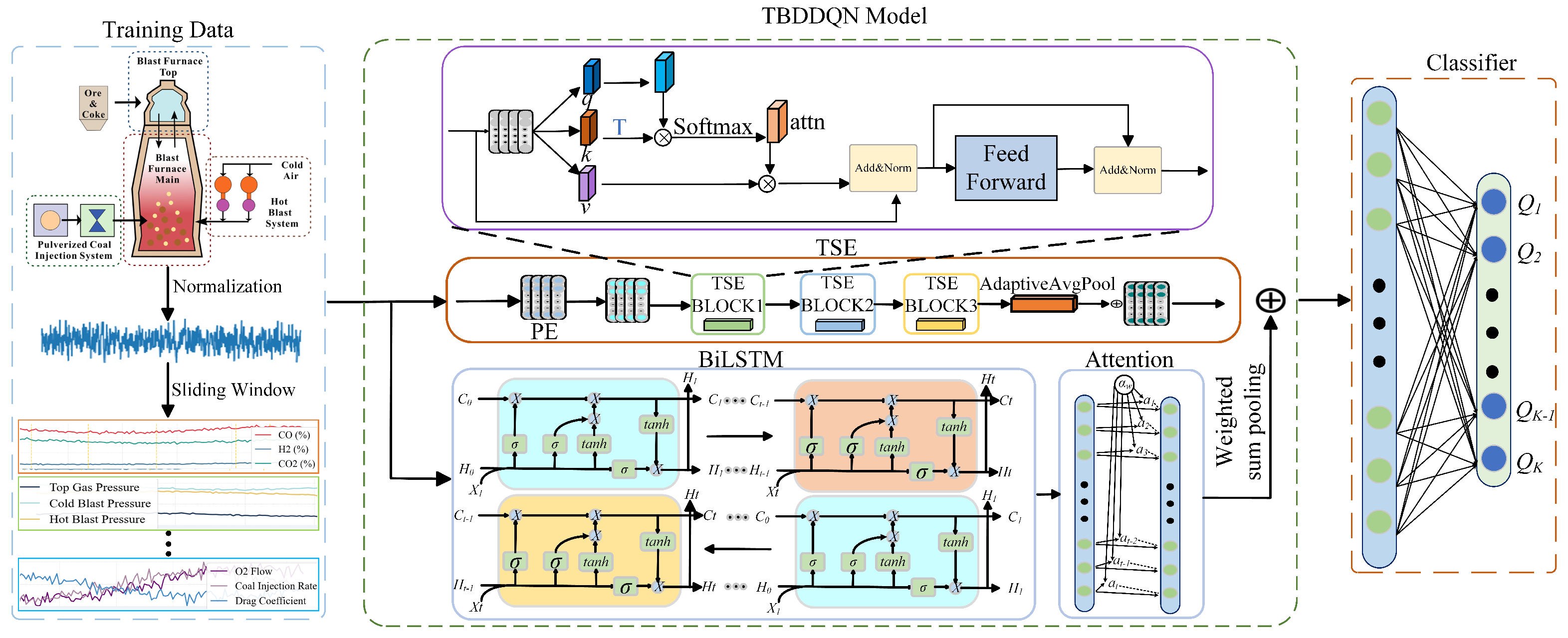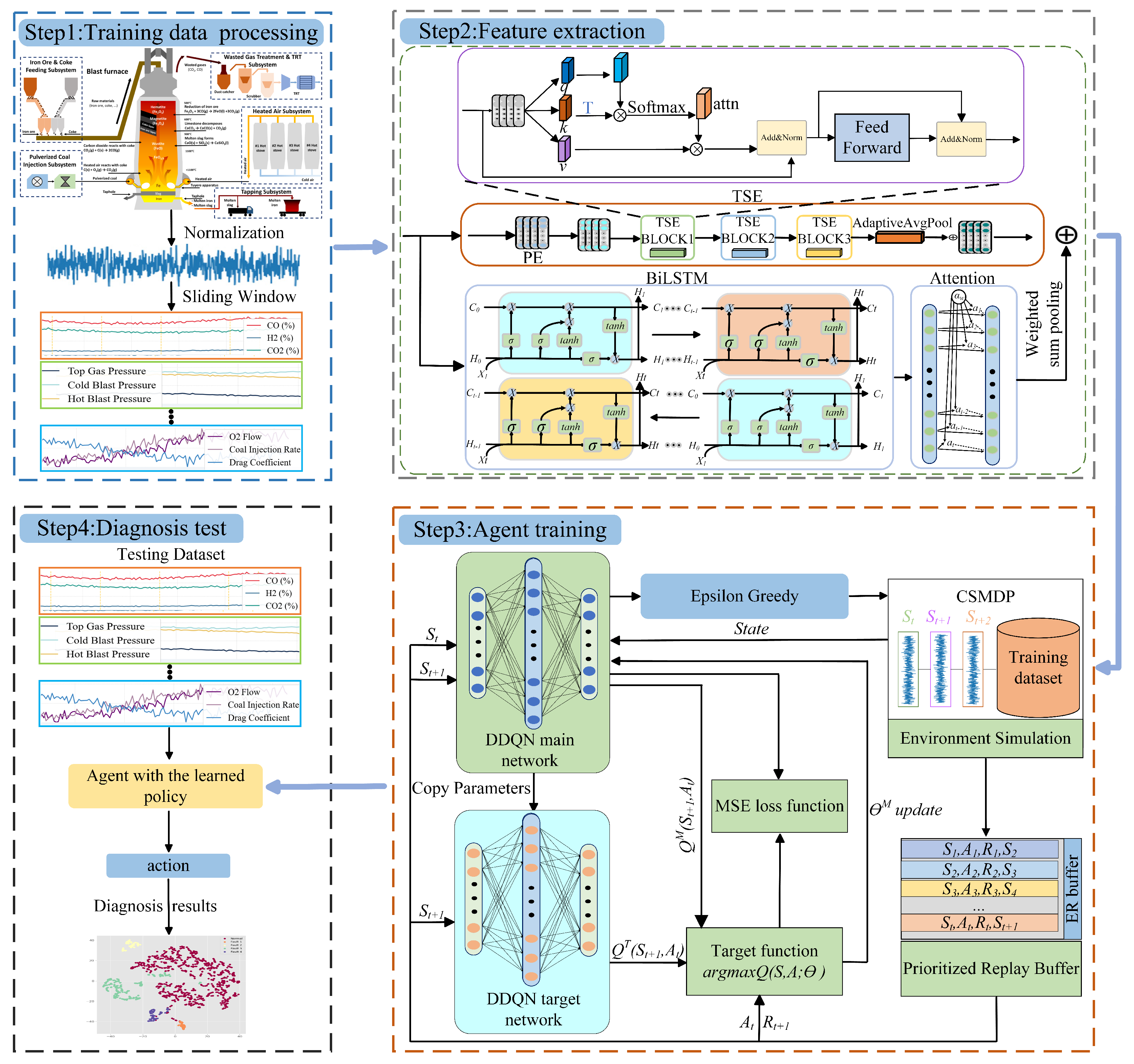 Considering the characteristics of blast furnace process data, effective fault diagnosis requires models that can simultaneously capture global correlations among multivariate variables and fine-grained temporal evolution patterns. Transformer architectures, equipped with multi-head self-attention, are well suited for extracting long-range contextual dependencies, while BiLSTM networks provide strong capabilities in modeling forward–backward temporal dynamics in sequential industrial data. However, even with powerful feature extractors, the challenges of data imbalance and asymmetric misclassification costs remain difficult to address using purely supervised learning. Double Deep Q-Network (DDQN) offers a principled solution by enabling cost-aware decision-making through interaction with the environment and by incorporating mechanisms such as prioritized experience replay to emphasize rare fault samples. Recent studies have made notable progress in this domain. Lou et al. [