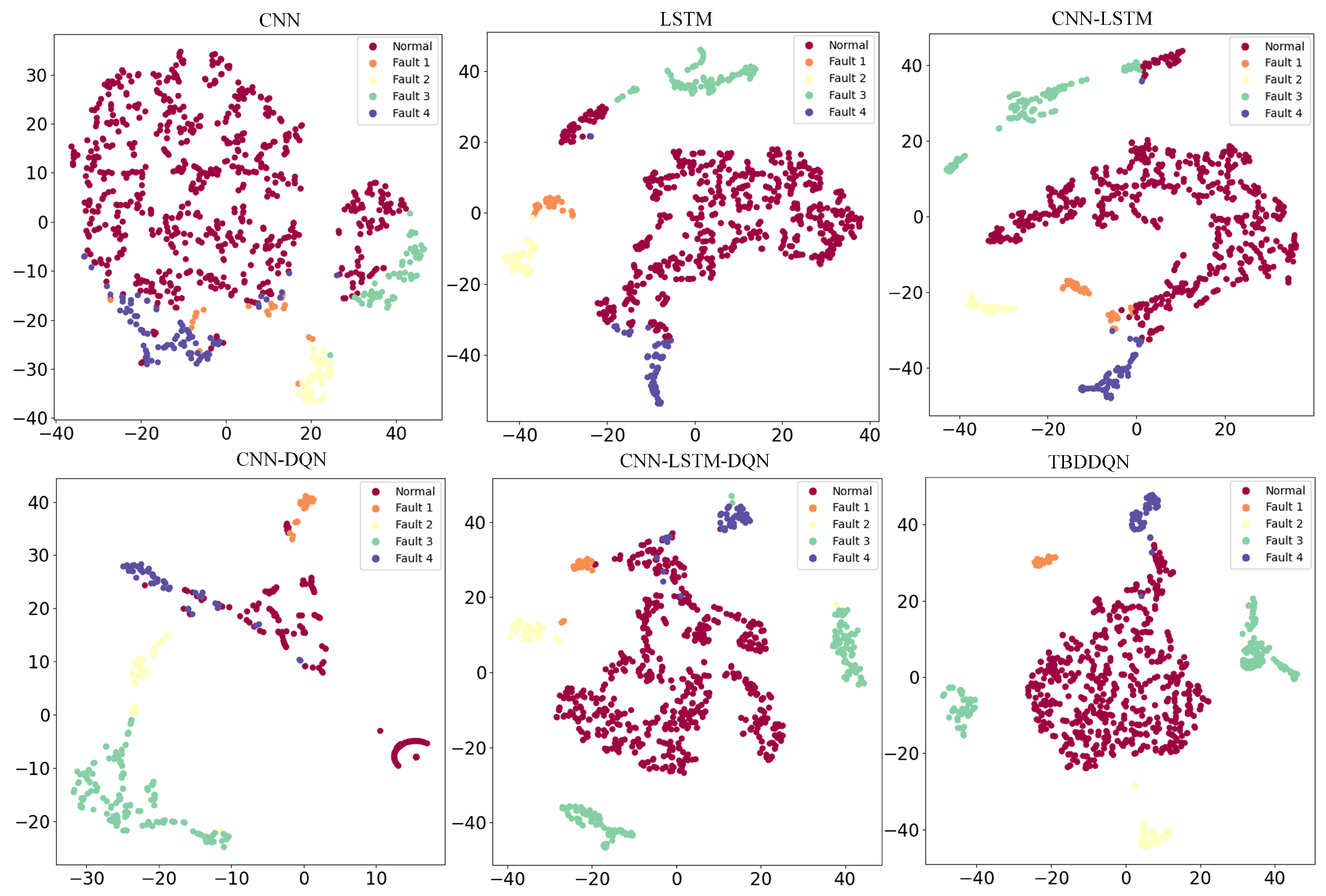 Figure 5, features extracted by TBDDQN display clearer cluster separations than those of CNN, LSTM, CNN-LSTM, CNN-DQN, and CNN-LSTM-DQN. The improved discriminability indicates that the dual-branch structure and adaptive cost-sensitive reward mechanism enable the model to learn more distinct class boundaries in imbalanced industrial scenarios.
