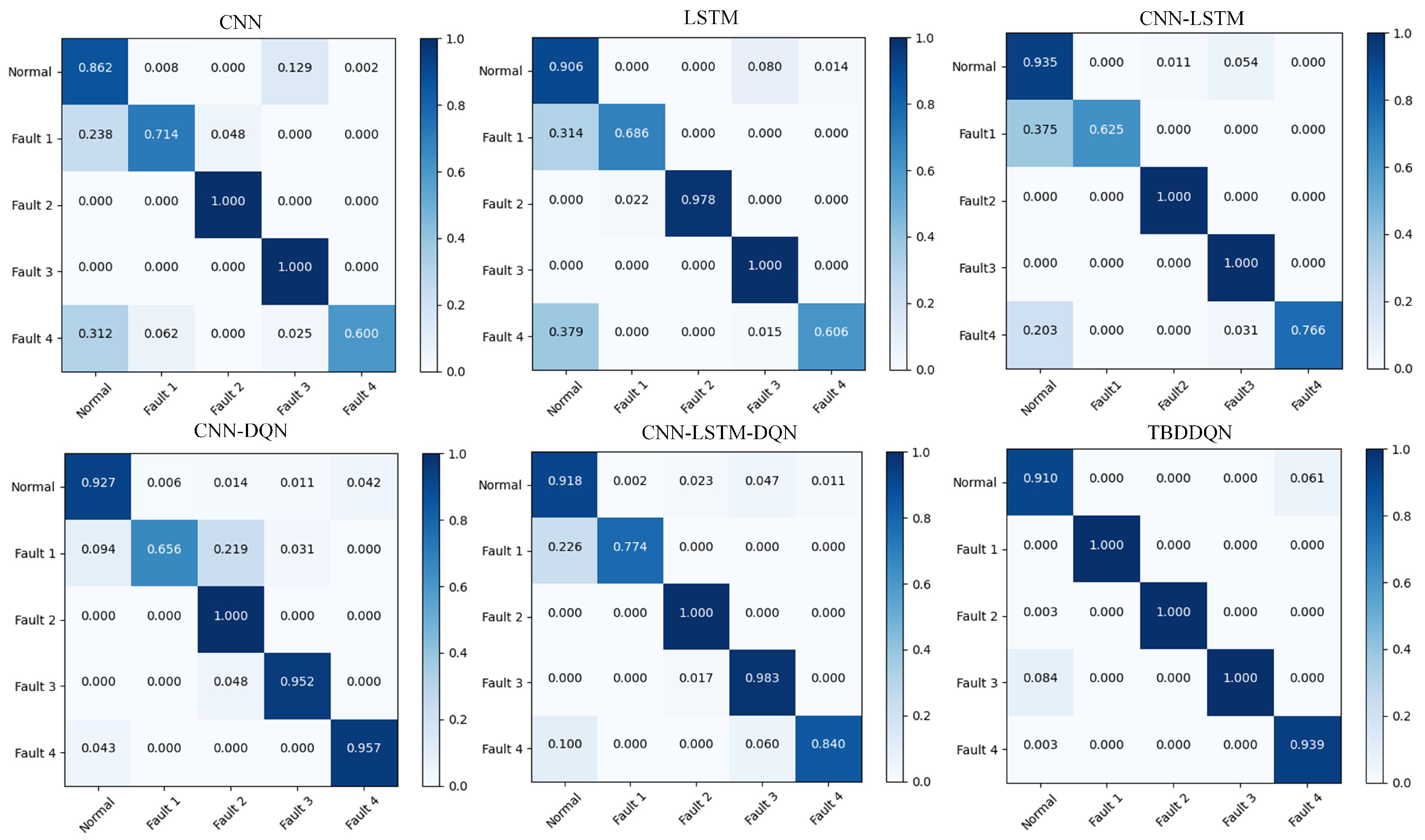 Table 3, TBDDQN also exhibits the best overall F1-score, achieving a weighted-averaged F1-score of 0.922 and a macro-averaged F1-score of 0.929. These results indicate that TBDDQN effectively balances precision and recall while maintaining stability across both major and minor fault classes.