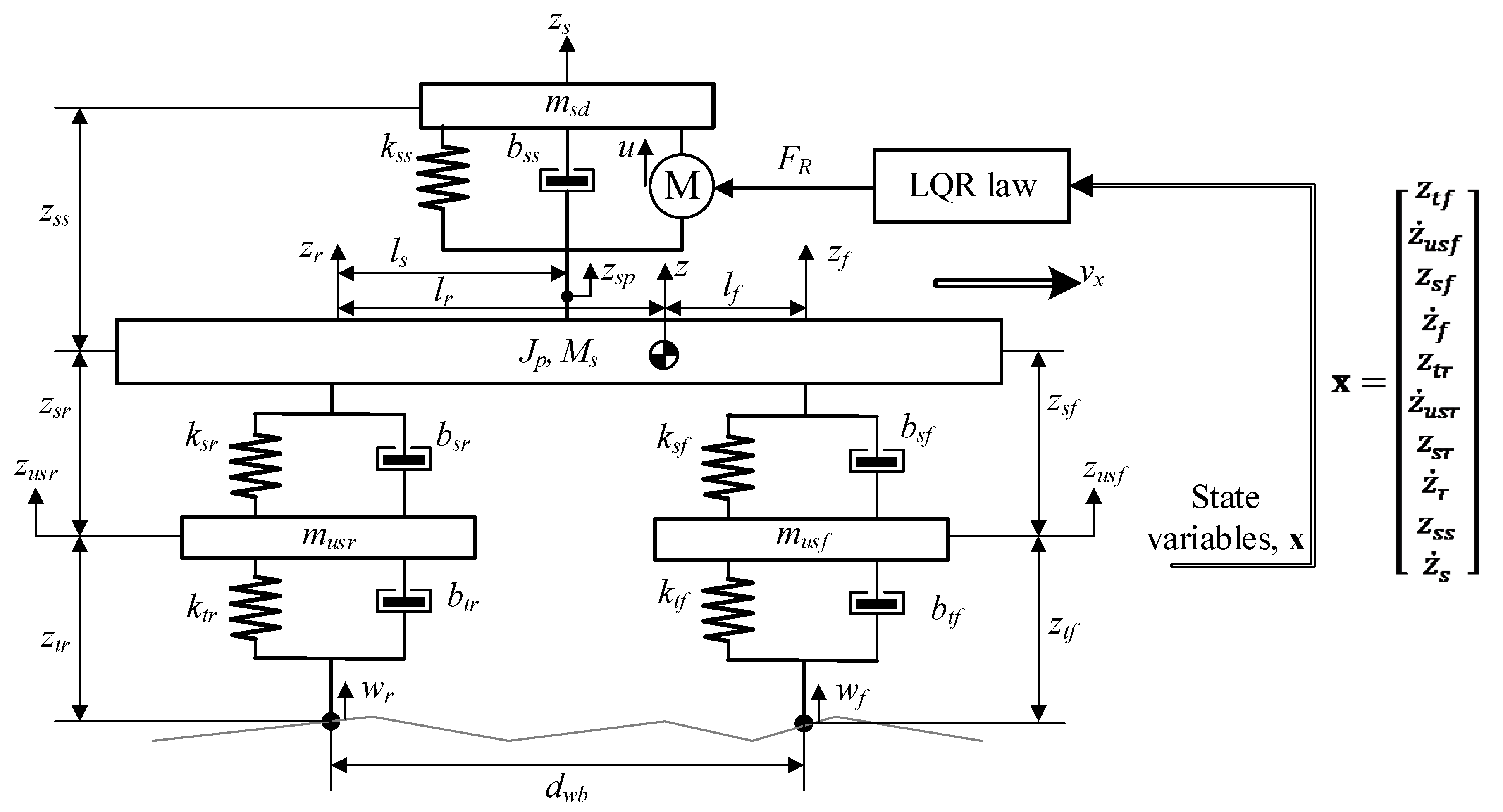 - Hrovat, D. Optimal Suspension Performance for 2-D Vehicle Models. J. Sound Vib. 1991, 146, 93–110. [Google Scholar] [CrossRef]