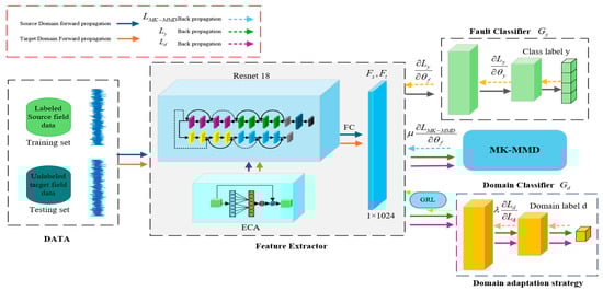 The source and target domain data are processed through convolutional layers and the ECA module, respectively, generating high-dimensional feature vectors. The source domain features are fed into the fault classifier to output fault category labels, while the target domain features undergo distribution alignment with the source domain features via the MK-MMD metric. By embedding the ECA module into the ResNet-18 network, the feature selection capability of ResNet-18 is optimized during the feature extraction stage through a dynamic channel weighting mechanism. While the convolutional kernels in the traditional ResNet-18 can progressively extract high-level features through multi-layer stacking, their fixed-weight convolution operations lack adaptability to the dynamic variations of fault features under complex working conditions. With the introduction of the ECA module, the network can adjust the weights of each channel in real time based on the characteristics of the input signal, enabling the model to accurately pinpoint fault-related frequency bands even during sudden speed changes, thereby enhancing the robustness of feature representation.