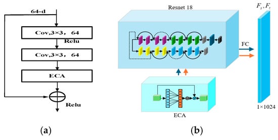 (a) Embedding location of the ECA module; (b) Efficient Feature Extractor of the E-DANNMK Model. The solid line denotes identity mapping, preserving the input and output dimensions, while the dashed line represents downsampling through a 1 × 1 convolution to align the output dimensions accordingly.