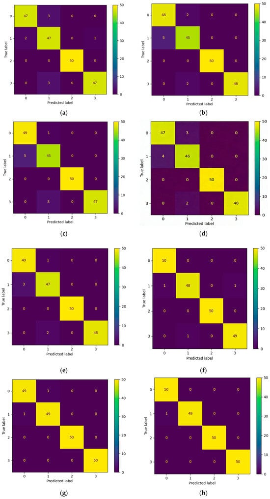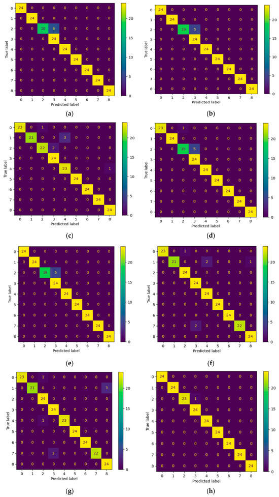 Comparison of confusion matrices across different models on the CWRU dataset: (a) CDAN; (b) CNN; (c) CORAL; (d) DANN; (e) DANN-MK; (f) CNN-Transformer; (g) DMT; (h) E-DANNMK.