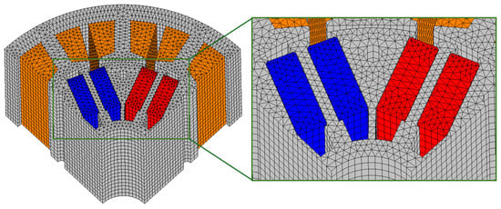 All electromagnetic analyses performed in this study were conducted using the nonlinear finite-element environment of Ansys Maxwell. The adopted FEA procedure was iteratively verified to ensure high numerical reliability of the derived results. To accurately capture the influence of permanent magnets on the air-gap flux density distribution, locally refined meshes were applied to both the permanent magnet and air-gap regions.