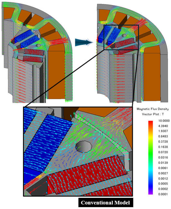 Fringing flux refers to a non-uniform magnetic flux component formed in boundary regions where high-permeability media, such as the rotor core or permanent magnets, are geometrically discontinuous. In these regions, the magnetic flux deviates from its ideal straight path and bends through the surrounding air region due to the sudden increase in magnetic reluctance. This phenomenon is inherently associated with magnetic boundary conditions and is commonly observed near magnet edges and air-gap terminations. It should be noted that fringing flux is physically different from leakage flux. Leakage flux represents magnetic flux components that deviate from the main magnetic circuit and fail to link with the stator windings, thereby directly reducing the effective air-gap flux. In contrast, fringing flux characterizes the way magnetic flux spreads near discontinuities and does not necessarily constitute a loss component by itself. Depending on the magnetic circuit configuration, fringing flux may either develop into leakage flux or be redirected into the main flux path. Accordingly, fringing flux does not always degrade electromagnetic performance. Instead, its contribution is strongly influenced by the magnetization direction of the permanent magnet, the geometric configuration of the rotor core, and the rotating direction of the machine, which together determine the final magnetic flux path. In the proposed asymmetric structure, the fringing flux generated at the magnet edge does not simply diffuse into the surrounding air region. Instead, due to the modified boundary conditions created by the overhang, a portion of the fringing flux is guided toward the rotor core and subsequently redirected toward the air-gap region. This behavior effectively reshapes the magnetic flux path near the magnet end. As a result, magnetic flux components that would otherwise escape in the axial direction are partially recovered and redistributed into the main flux path. This redistribution mechanism directly contributes to a reduction in axial leakage flux and an increase in the effective magnetic flux crossing the air gap. As observed in Figure 15, when the rotor rotates in the counterclockwise direction, the S-pole permanent magnet magnetized in the parallel rightward direction is subjected to the overhang configuration. Under this condition, the magnetic flux distribution near the magnet edge is noticeably modified, and a pronounced fringing flux region is formed. The fringing flux generated in this region becomes locally concentrated within the rotor core, where the magnetic reluctance is relatively low.