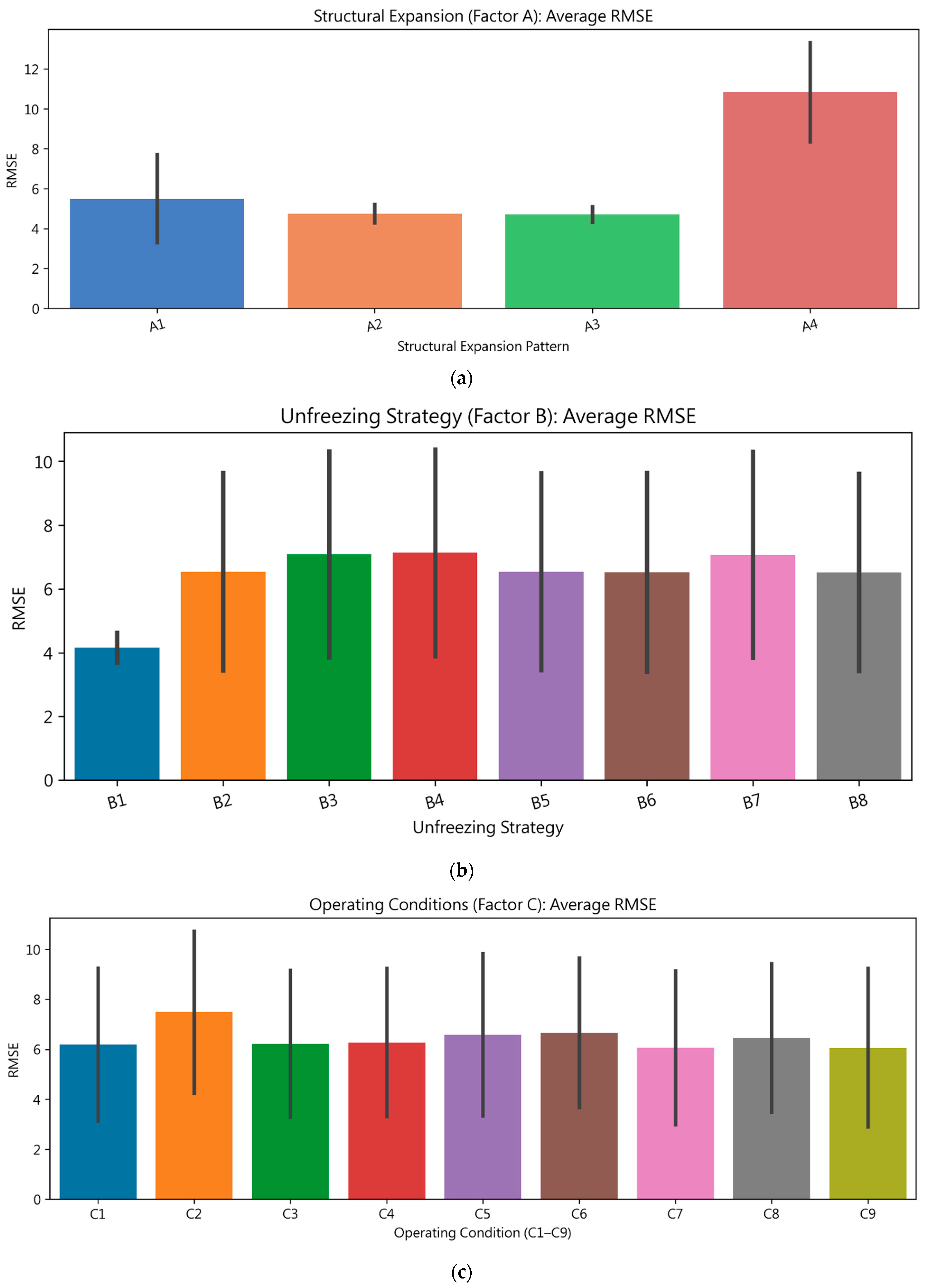- The optimal combination of main-effect factors was determined by selecting the levels of Factors A, B, and C that yielded the lowest overall RMSE values. Accordingly, the optimal main-effect settings were found to be as follows: structural expansion strategy = A3 (inserting a hidden layer after the LSTM output layer followed by a dense layer); parameter-unfreezing strategy = B1 (no layers unfrozen); and operating condition combination strategy = C9.