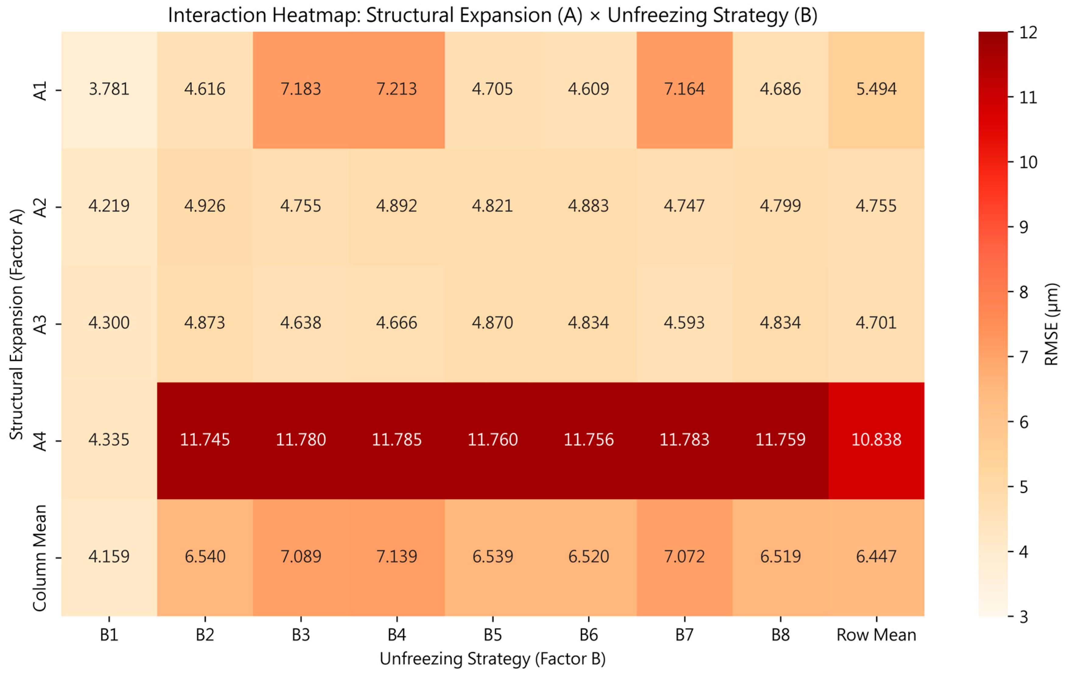 - Similarly, A1 (inserting a dense layer after the input layer) also produced a high RMSE when the hidden or output layer was unfrozen. Inserting a dense layer into the input layer forces the model to relearn thermal feature maps, thereby disrupting the pre-learned temperature–deformation representation. As more layers are unfrozen, the modified input path disrupts the stability of feature alignment further, leading to increased prediction errors and less stable transfer.