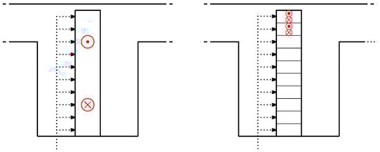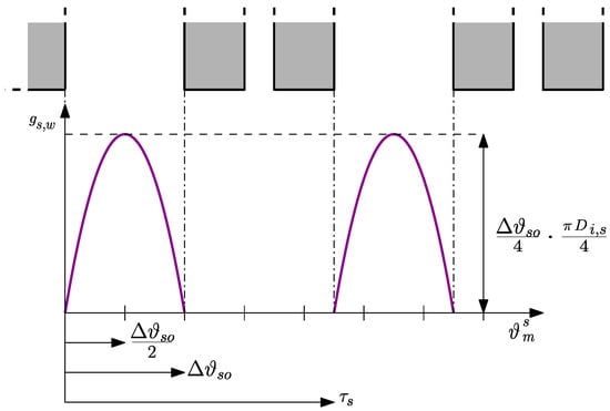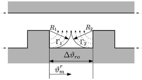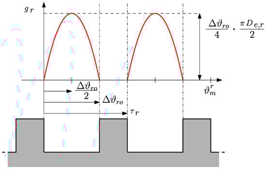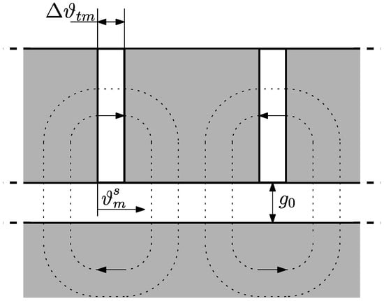 The stator equivalent air-gap function is computed by considering only the effect of winding and magnet slots, thus assuming a smooth rotor. Firstly, the equivalent air-gap function , associated with winding slots, is computed, by assuming indefinitely deep slots and a simplified circular path for the leakage flux lines as in [15]. The equivalent path of the flux lines is obtained by means of two parallel paths, and , as shown in Figure 3, where the radius of these circular paths depends on the angular coordinate .