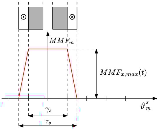 By assuming a linear variation in the MMF within the PMs, the MMF function is represented by a trapezoidal wave with a period of , as shown in Figure 9, which can be expressed by means of the Fourier series expansion as
