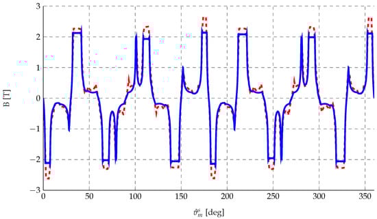 Air-gap flux density: analytically computed (blue) and FEM-computed (dashed red).