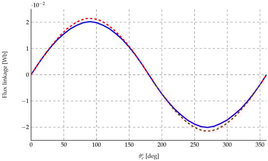 The no-load flux linkage obtained with the two models is compared in Figure 13. The maximum value analytically computed is , while the value obtained through the FEM is , resulting in a relative error of .