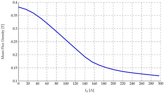 The inductance behavior over the domain results in non-negligible reluctance torque values for high-load working points; see Figure A5. However under nominal current condition (), the reluctance torque component is inherently very small, and the electromagnetic torque is therefore mainly determined by the permanent magnet contribution.