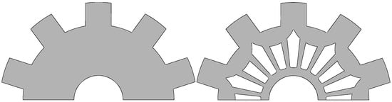Rotor geometry before iron mass reduction (left); rotor geometry after iron mass reduction (right).