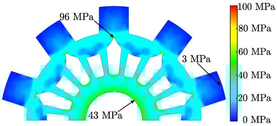 However, the resulting lightweight structure introduces areas where the cross-sectional thickness (in the plane) is significantly reduced. Considering the high rotational speed of the machine, a mechanical stress analysis becomes necessary to verify the structural integrity of the rotor and to ensure safe operation under centrifugal loading. The results shown in Figure 21 indicate that the maximum stress at 20 remains well below the material yield strength reported in the datasheet ( 260 ).
