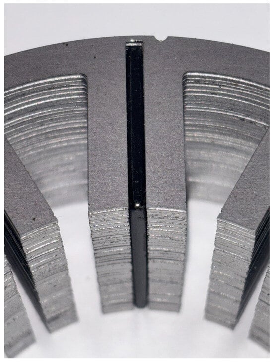 The laminations used in the prototype are coated with a backlack insulation layer, which enables the stack to be bonded through thermal curing without the need for welding or soldering. This process ensures that the laminations remain fully electrically insulated from each other. However, the adoption of this solution requires special care during manufacturing, particularly to ensure proper alignment of the iron laminations throughout the thermal curing process. For the rotor, this issue is solved by curing the laminations while they are already stacked onto the shaft. In the stator, lamination alignment is finally achieved by inserting 12 mm pins into the slots instead of using notches on the outer diameter, as this provides greater structural solidity. High-temperature-resistant insulating spacers, similar to those commonly used in transformer winding manufacturing, are also inserted to preserve the magnet slot geometry during the curing process.