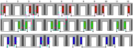 Since the manufactured prototype is intended for laboratory investigations and experimental analysis, not all tooth coils belonging to each phase have been permanently connected by soldering. Some coil connections have intentionally been left open, as shown in Figure 26, in order to allow the implementation of a six-phase asymmetrical winding configuration, enabling further studies on multiphase applications.