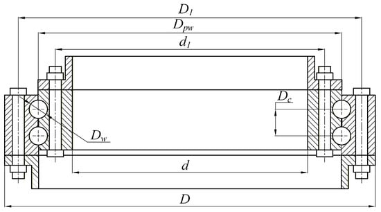 In the formula, ri and ro represent the curvature radii of the inner and outer raceways, fi and fo are the curvature radius coefficients of the inner and outer raceways, Dw is the diameter of the rolling elements, Ga is the clearance of the bearing (in this study, a zero clearance is adopted), and α0 is the contact angle between the rolling elements and the raceways, as shown in Figure 5: