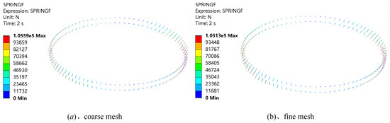 To verify the influence of mesh density on the simulation results, mesh independence tests were conducted. Based on the initial setup, the mesh was coarsened and refined, resulting in a coarse mesh with 356,784 elements and a fine mesh with 469,272 elements, respectively. The results are shown in Figure 9. The maximum contact load obtained by the coarse mesh is 105.6 kN, and that obtained by the fine mesh is 105.1 kN. Compared with the maximum contact load obtained by the original mesh quantity, they have decreased by 0.47% and 0.94% respectively. The results show that the results obtained by the original mesh are accurate.