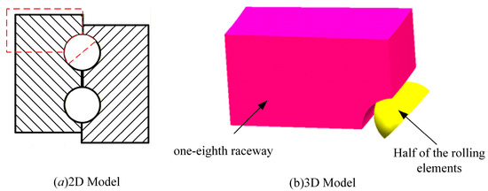 When nonlinear springs and rigid rods are used instead of rolling elements, the contact pressure and fatigue life between the rolling elements and the raceways cannot be obtained. Each row of the double-row four-point contact ball slewing bearing has 90 rolling elements. After being subjected to load, the maximum contact pressure and the minimum service life will only exist in the contact area between the rolling element that is subjected to the greatest force and the raceway. Only the sub-models of part of the raceway and rolling elements need to be taken for calculation. The sub-model includes one eighth of the inner raceway and half of the rolling elements. The two-dimensional structure is shown in Figure 10a. The three-dimensional structure is shown in Figure 10b.