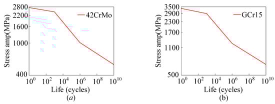 ANSYS nCode DesignLife 2022 is a software for structural fatigue durability analysis, widely used in fatigue analysis and life prediction. As part of ANSYS, it has good compatibility with ANSYS Workbench, etc. [32] There are no materials for raceways and rolling elements in the database of ANSYS nCode DesignLife. However, the software provides a drawing module for material fatigue curves. Users only need to input the tensile strength of the material to obtain the fatigue life curve of the material. The tensile strengths of the raceways and rolling elements are 1347 MPa and 1617 MPa respectively. The fatigue curve parameters obtained by the software were corrected [33], and the obtained fatigue curves are shown in Figure 13.