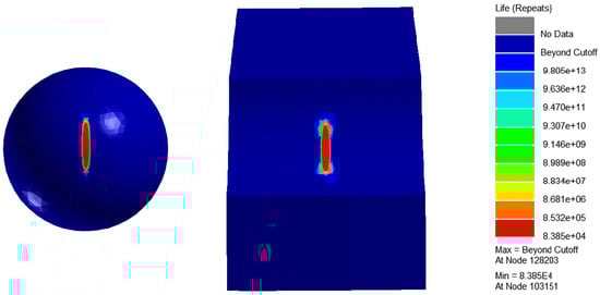 Fatigue spalling of rolling bearings is mainly caused by the gradual expansion of cracks to the surface due to shear stress beneath the rolling surface [30]. Therefore, when conducting stress analysis, shear stress is selected as the stress standard, and Goodman is used to correct the curve. The calculation results are shown in Figure 14. The minimum life is 8.385 × 104 cycles, and the region with the minimum fatigue life is concentrated at the rolling element–raceway contact interfaces.