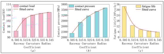 Influence of raceway curvature radius coefficient on bearing performance on (a) contact load, (b) contact pressure and (c) fatigue life.