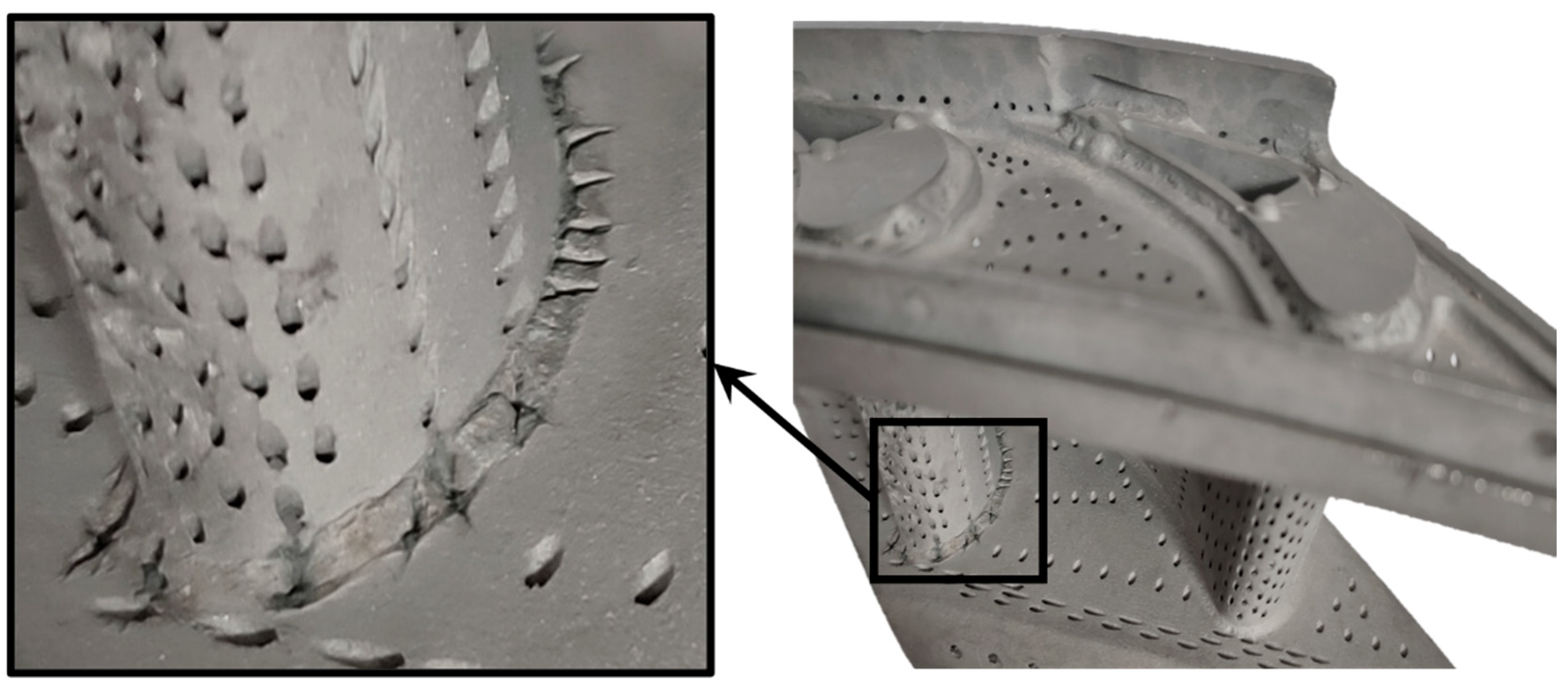 - Xu, Z.; Liu, C.; Ye, L.; Zhu, H.; Wu, Z. Investigation of the effect of combustor swirl flow on turbine vane full coverage film cooling. Energy 2024, 295, 130965. [Google Scholar] [CrossRef]