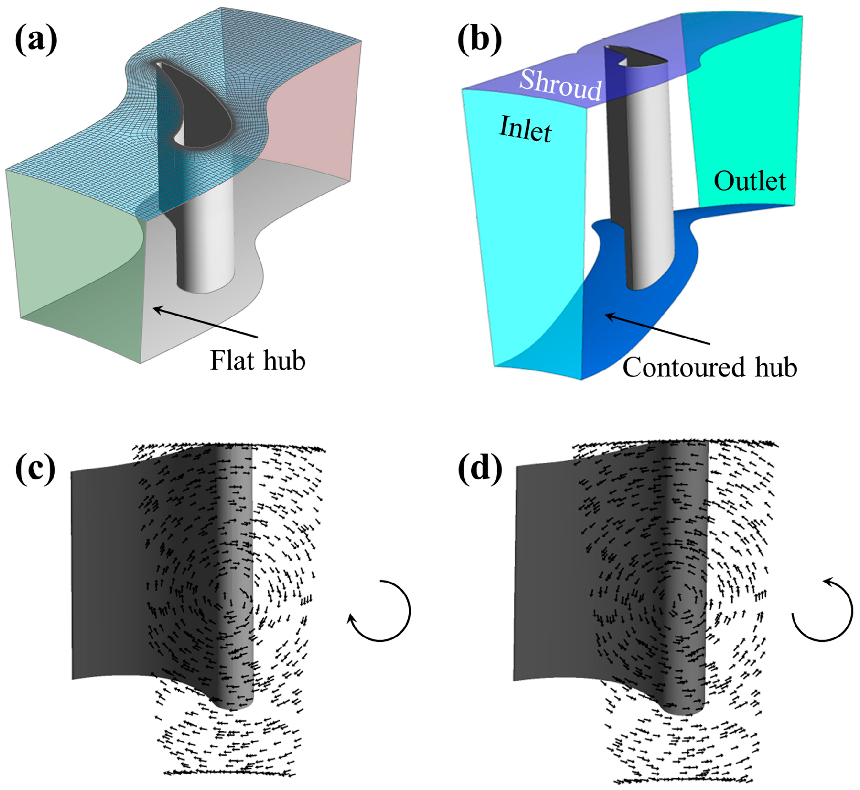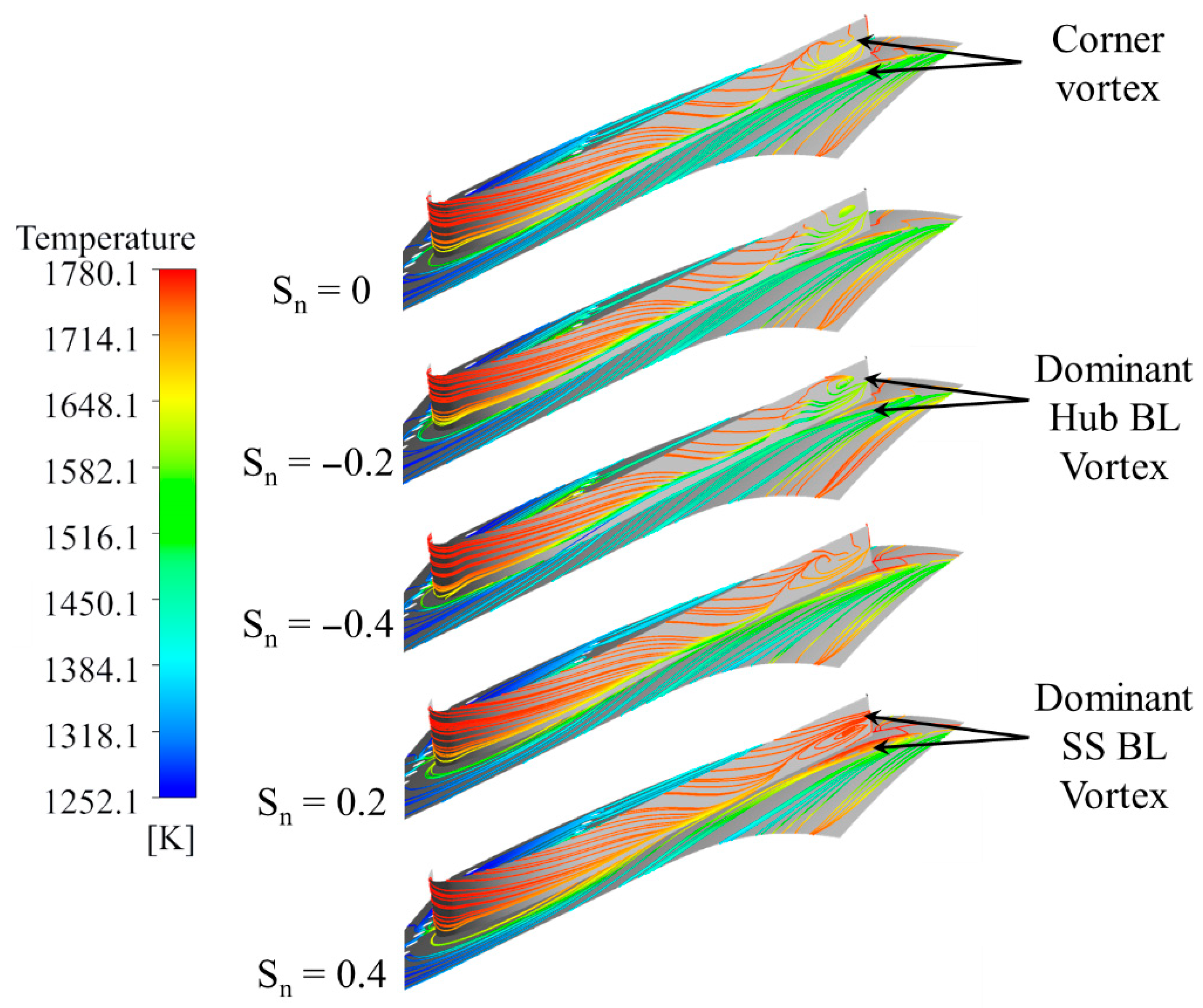 - Schmid, G.; Schiffer, H.-P. Numerical Investigation of Inlet Swirl in a Turbine Cascade. In ASME Turbo Expo 2012: Turbine Technical Conference and Exposition; American Society of Mechanical Engineers Digital Collection: Copenhagen, Denmark, 2013; pp. 543–552. [Google Scholar] [CrossRef]