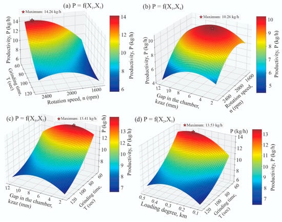 - Scientific insight into process mechanisms: For the first time, the relative influence and interaction effects of all key factors were quantified and visualized through adequate regression models (R2 > 0.93 for all responses, p < 0.001) and Pareto charts. Grinding time (X5) and rotational speed (X1) were identified as the dominant factors, with their linear effects exceeding those of other parameters by a factor of 3–5. Significant quadratic effects for speed (X12), filling ratio (X22), and clearance (X42) confirmed the existence of well-defined optima within the experimental domain, explaining the nonlinear nature of the throughput response. The negative interaction between speed and time (X1X5 = −0.84) revealed that simultaneous operation at maximum values is counterproductive—a finding with direct practical implications for process tuning. Positive interactions involving clearance (X1X4 and X4X5) demonstrated the potential for compensating negative effects through careful adjustment of geometric parameters.