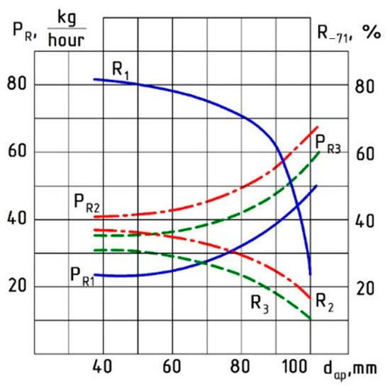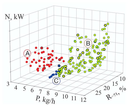 - Zone C (“Energy Efficiency”): 6.8% of solutions, achieving the lowest power consumption (3–5 kW) with moderate quality (R−71 = 20–25%) and throughput (10–12 kg/h), highlighting the challenge of simultaneously meeting stringent quality and energy-saving targets.