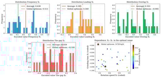 Robustness analysis (Monte Carlo). To assess the stability of the optimal solution under real industrial conditions with random parameter fluctuations, a Monte Carlo simulation with 10,000 iterations was performed. Random variations in all five factors within ±5% of their optimal values were introduced, assuming normal distribution. The analysis showed that in 95% of cases, the deterioration of the integral criterion F(X) did not exceed 8%. The output parameters remained within the following ranges: R−71 ≈ 28.0–32.0%; P ≈ 9.1–10.5 kg/h; N ≈ 4.4–5.3 kW; Eud ≈ 5.2–6.3 kWh/t; Mud ≈ 0.60–0.74 t·h/t.