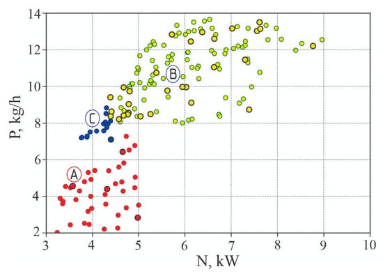 The plot enables visual identification of permissible parameter ranges and serves as a basis for developing practical recommendations for equipment tuning, taking into account the compromise between throughput and grinding quality.