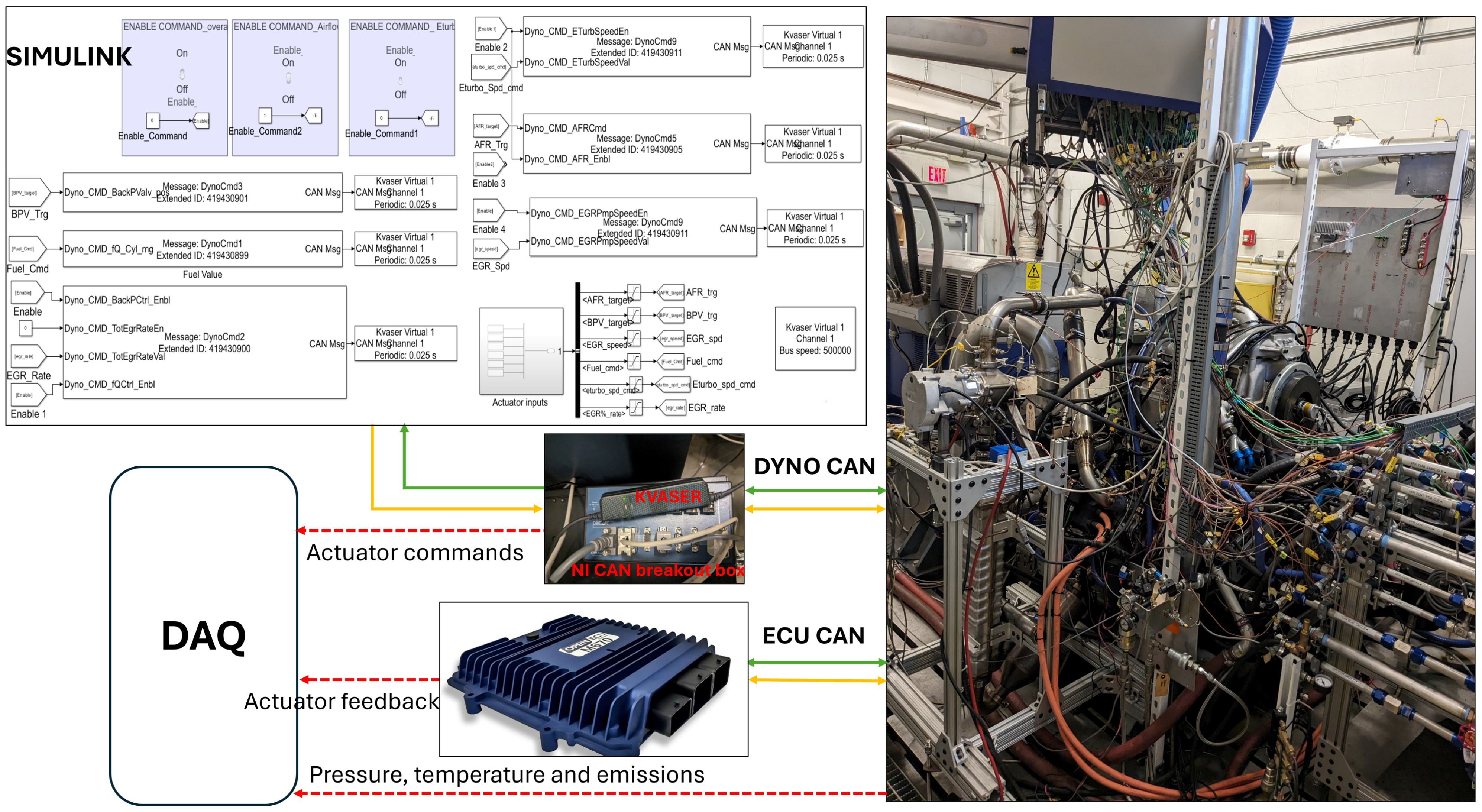 During the transient tests, the airpath actuators, along with the fuel injection quantity, were controlled synergistically to replicate various control strategies that can potentially improve emissions and performance of the engine. For steady state operations, these actuators operated on feedforward pre-calibrated maps. However, during transient operation, where calibration between steady-state points was absent, actuator positions were explicitly defined at high temporal resolution using a command array. To ensure repeatability, an HIL configuration was set up, and the actuator command values were sent over the CAN bus using extended 29-bit identifiers. The engine’s Electrical and Electronic Architecture (EEA) supported two separate CAN bus communications between the actuators, sensors, and the ECU. A KVASER CAN device was used to transmit these actuator commands over the dyno CAN, while the feedback was recorded using the ECU CAN along with the physical thermocouples and pressure sensors. The bus traffic was maintained at a 500 kbaud rate, and the CAN messages transmitting frequency was set to 50 Hz. The actuator signals were generated using a SIMULINK model, which served as the interface between the hardware (KVASER CAN) and the actuator command arrays loaded in the MATLAB (R2022B) workspace. The start and end conditions for each transient tip-in event were derived from prior steady-state tests conducted on the two-cylinder engine configuration. Transient rate profiles were generated via a ramp function in SIMULINK to define actuator trajectories between these boundary points. A schematic of the HIL configuration is provided in