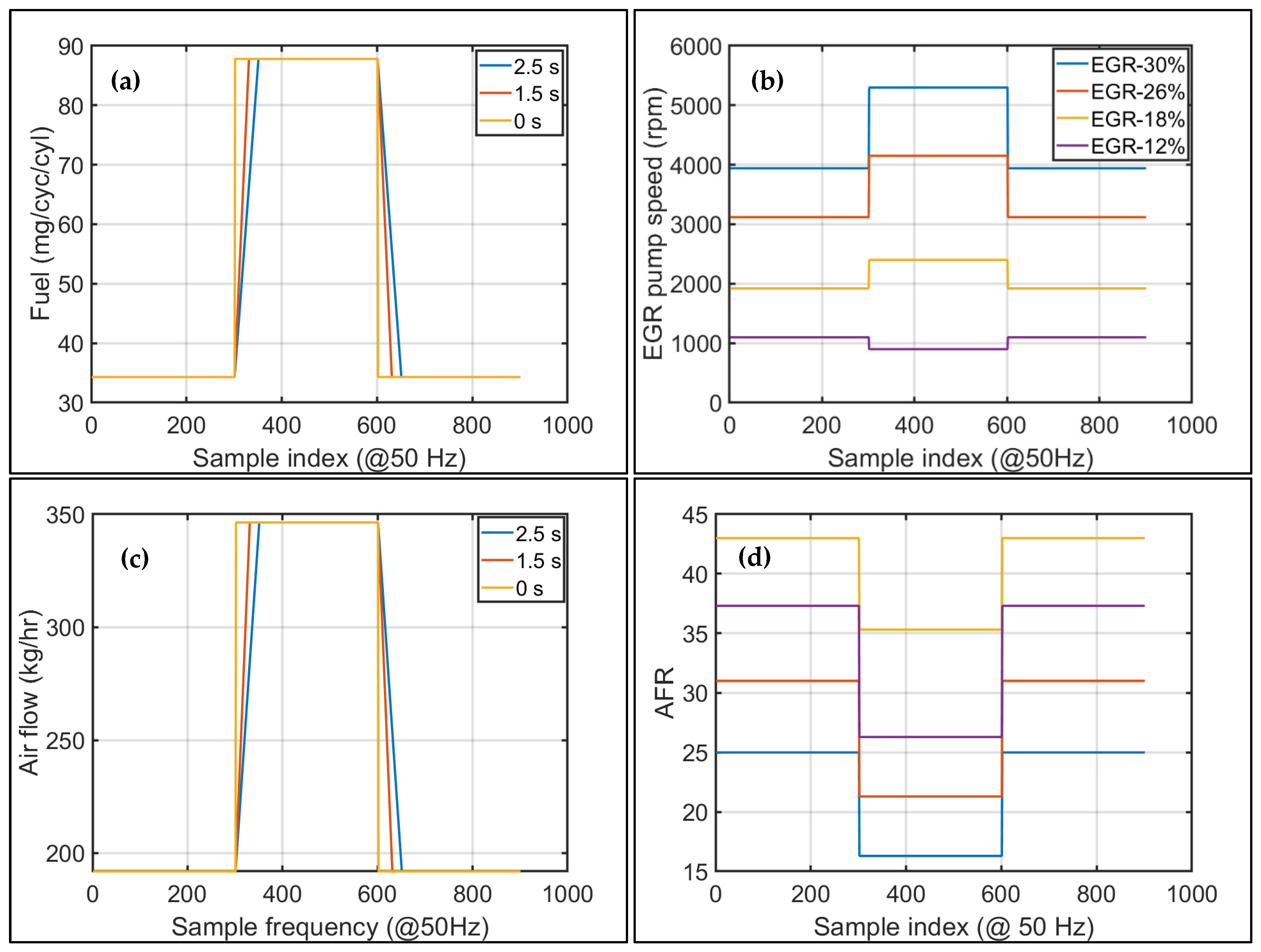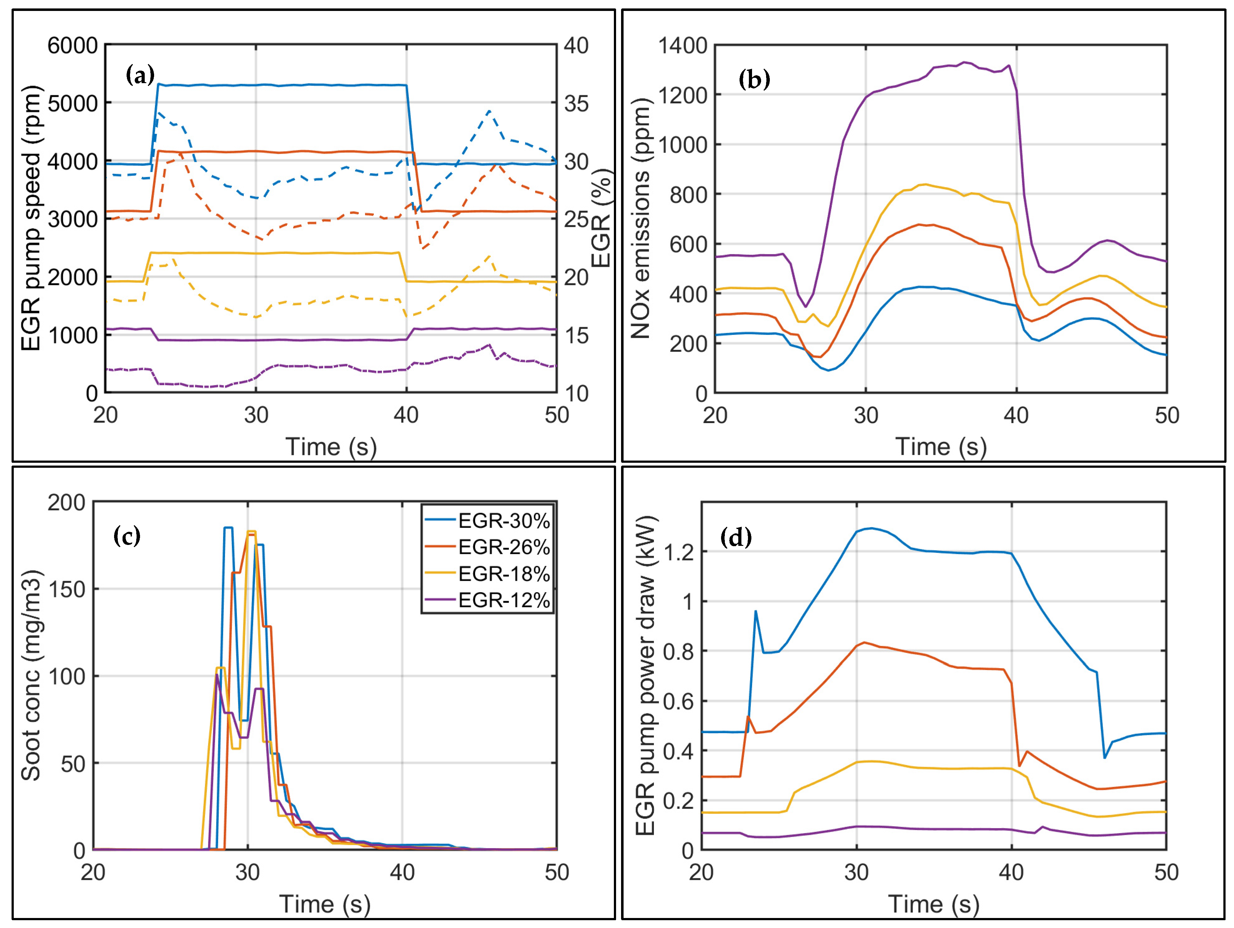 Case 3: EGR pump operated at its slowest steady speed possible (EGR 12%) to prevent stalling or short-circuiting. Fueling and airflow remained unshaped (0 s ramp).