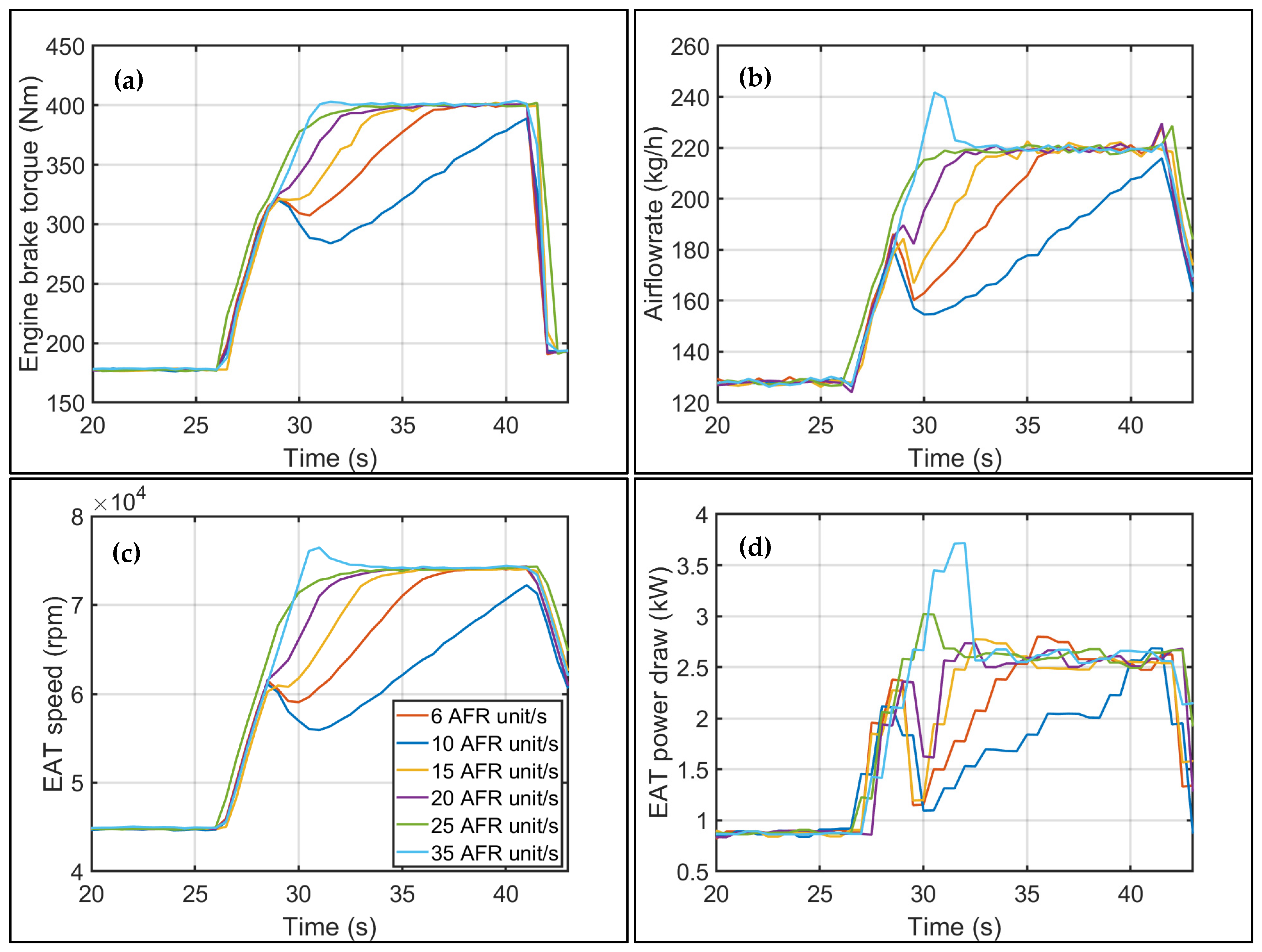 Figure 4, while the fuel injection rate was a square pulse (instantaneous step change). Reducing the AFR ramp rate resulted in a delayed torque response, whereas higher rise rates led to increased electrical power consumption. Cumulative energy usage during the transient increased by 17.6% as the EAT speed rise rate increased to provide air flow rates from 6 to 35 AFR units/s. Further acceleration of the EAT was constrained by the mechanical limitations of the prototype. Also, a two-stage ramp can be seen in all figures, which was due to a finite time taken by the PI controller to react to the manual ramp rate overrides.