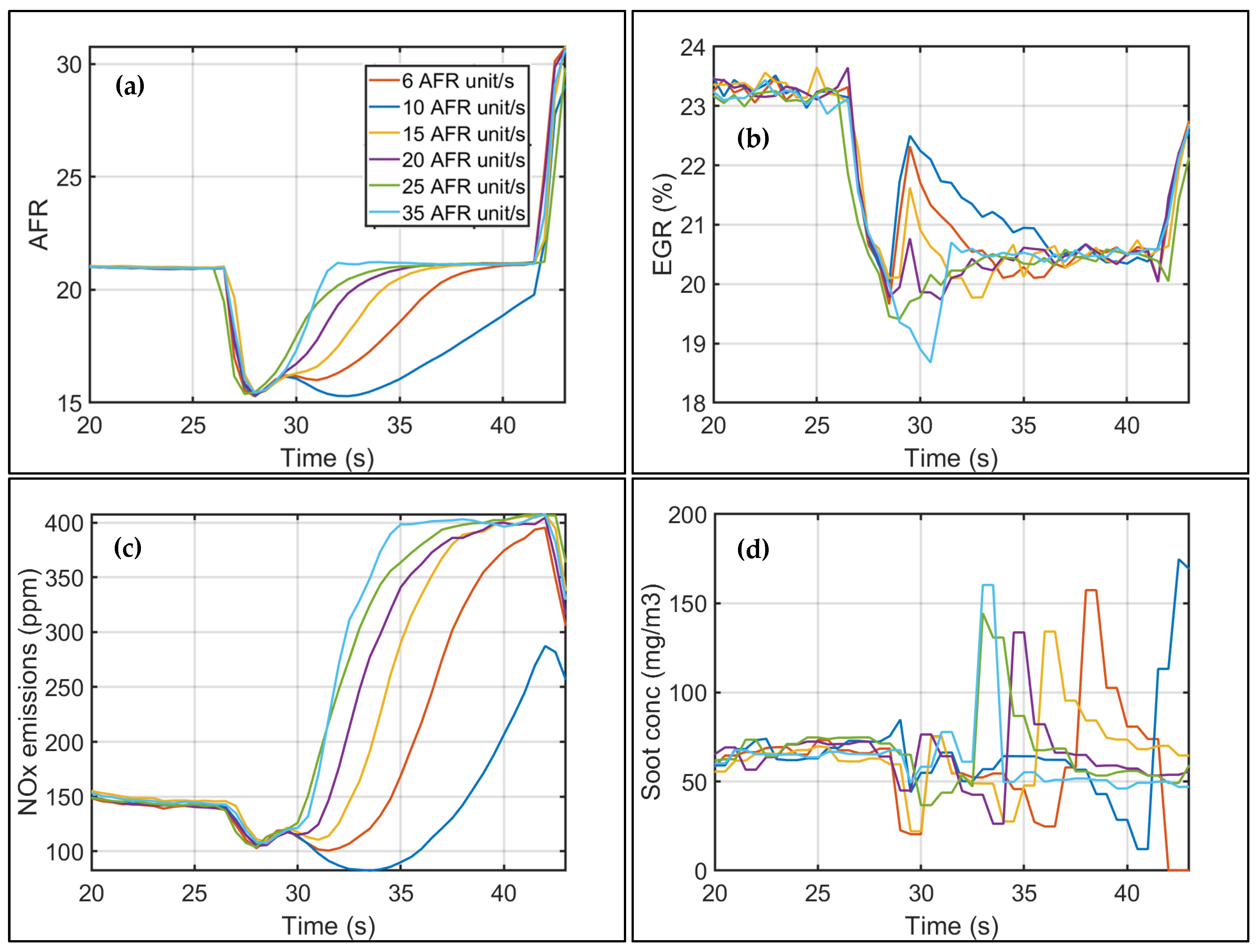 Figure 5, which shows an inverse relationship between the EGR flow rate (%) during tip-in and the AFR rise rate. As the AFR rise rate increased from 6 to 35 AFR units/s, the combined effect of enhanced airflow and reduced EGR during the tip-in led to a 10.5% reduction in soot emissions. Although there were soot spikes in all cases, the cumulative soot emissions during the transient reduced proportionally as the duration of the soot spike reduced with an increase in AFR ramp rate. However, this also resulted in a 25% increase in NO