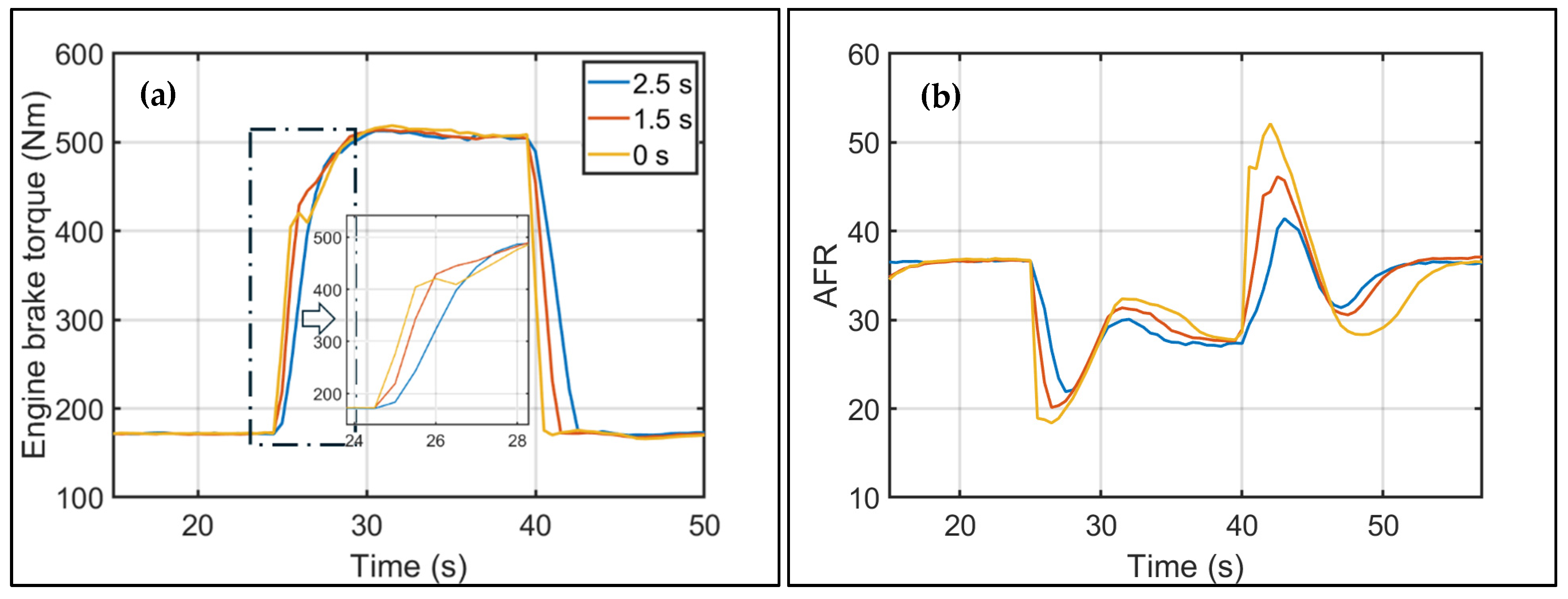 Figure 6 illustrates the resulting changes in engine torque ramp rate. The 0 s case corresponds to an instantaneous load step, implemented through a square-pulse fuel injection command without rate shaping. The 0 s case still has the actuator delay, but as it was constant in all cases, it was not specifically documented for this study. During the tip- in event, as fuel injection occurs, the air–fuel ratio near the plume periphery reaches rich stoichiometric conditions due to the heterogeneous nature of mixing controlled diesel combustion. Consequently, during this event, the global air–fuel ratio tilts to rich values, leading to the highest observed soot emissions as the engine traverses the soot islands on the phi-Temperature plot. Notably, the EAT remains at an elevated speed even after the load step as the turbos have completely spooled up, allowing the AFR to rebound from rich to lean conditions when the injection event is slashed by 75% at tip-out, leaving an excess of air in the combustion chamber, most rapidly in the 0 s case (