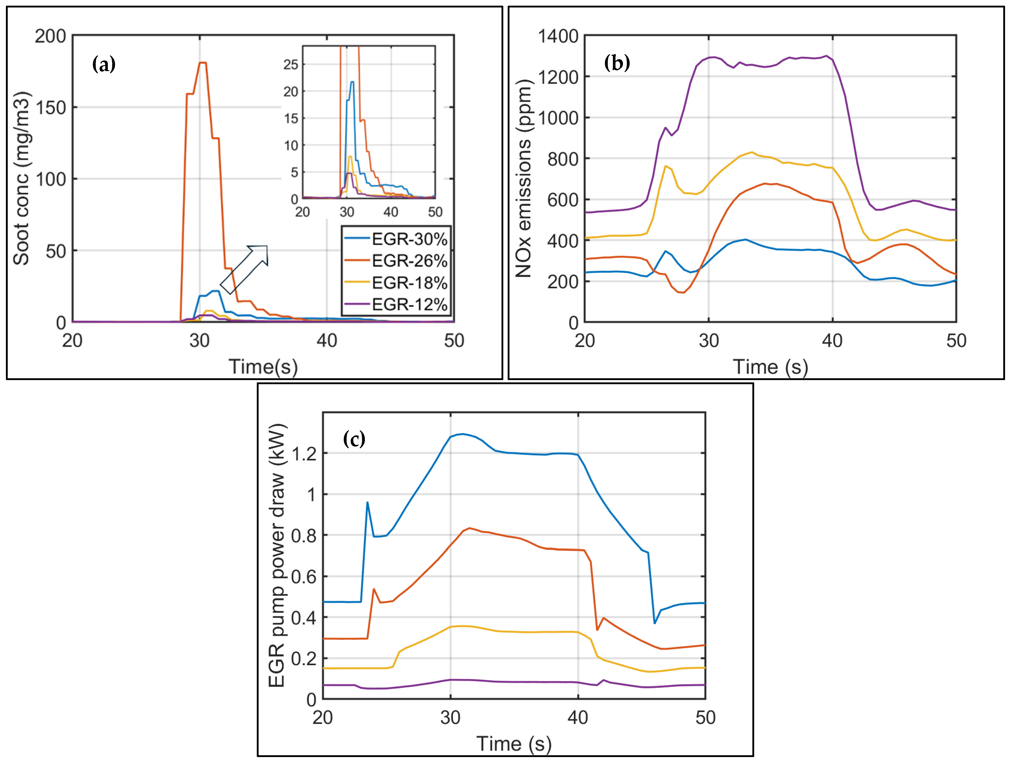 x emissions without compromising transient response. In this study, cumulative soot emissions decreased by 30% as the average EGR rate was reduced from 30% to 12%. However, since injection timing remained unchanged, cumulative NO