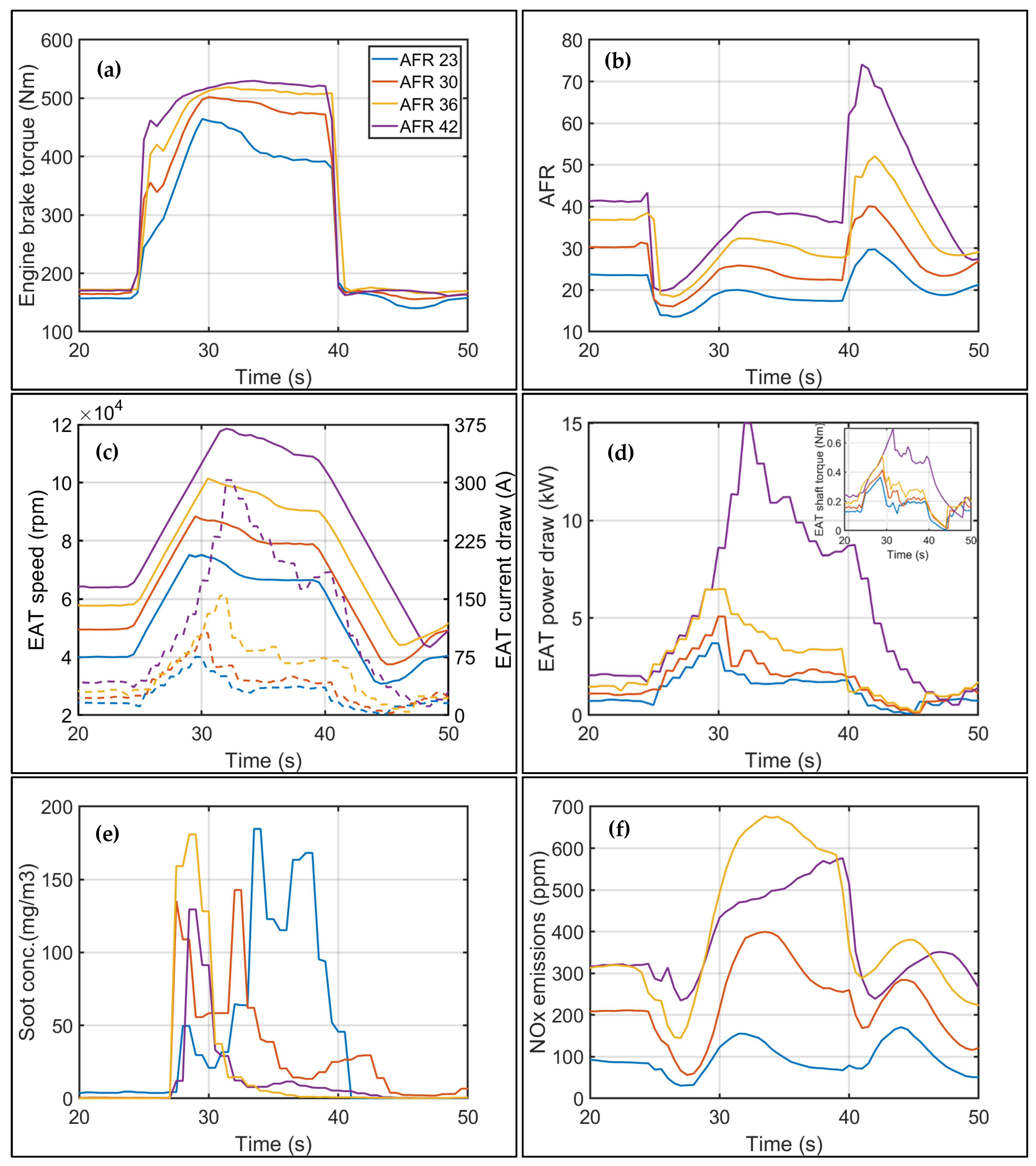 Compared to a conventional mechanical turbocharger, an EAT introduces an additional degree of freedom to engine control. For a fixed fueling rate, this enables operation at leaner air–fuel ratios (AFRs) by supplementing boost with electrical power, thus providing a means to reduce transient smoke emissions without compromising transient response. To explore this benefit, a series of transient tests was conducted with varying engine AFRs, achieved by modulating EAT speeds using electrical power. From rich to lean, the starting levels for these tip-ins varied from an AFR of 23 to 42. These bounds were decided based on extensive steady state testing, where an upper limit of the turbo speed was imposed in software to limit the inrush current during tip-in. Therefore, the starting range of AFRs at B25 load was accordingly calculated so that the EAT was able to complete the B75 load step without hitting the soft limiter on its speed. The lower AFR limit was constrained to ensure the in-cylinder mixture did not drop below stoichiometric levels during tip-in.