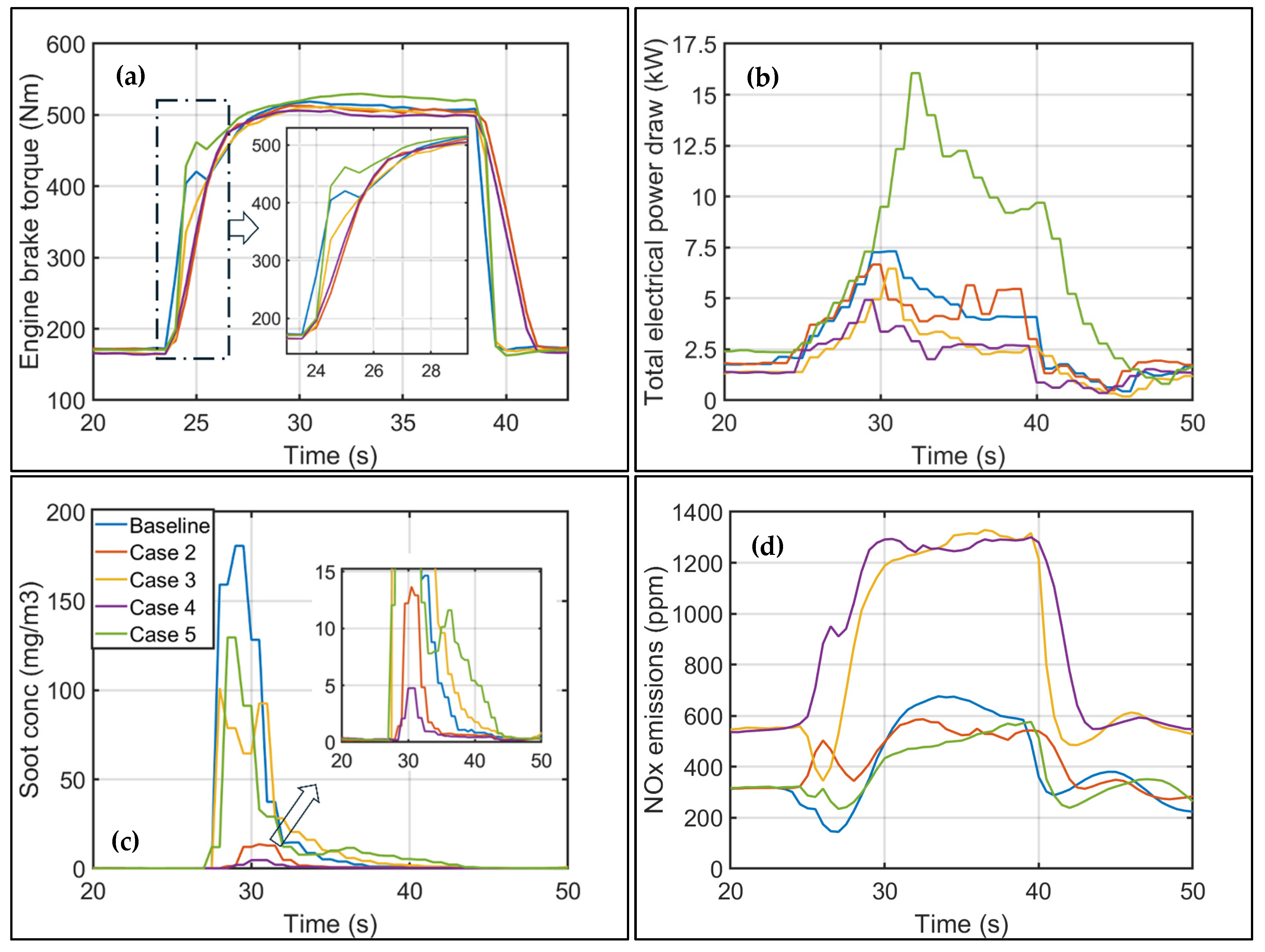 Case 4: Combination of the lowest fueling ramp (200 Nm/s) and minimum EGR rate (12%), representing the least aggressive transient from both fueling and EGR perspectives. Similar to Case 2, this case would require a traction e-motor in a hybridized powertrain to supplement the engine torque and supply the driver-requested torque during the transient.