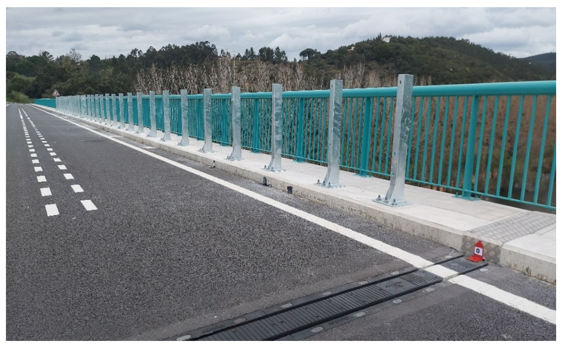 The Portela bridge (outskirts of Coimbra, Portugal), located at (40°11′4.35″ N, 8°23′44.19″ W), was selected for the field tests; its entire length is sufficient to accommodate both an acceleration section and a test section. The bridge deck—measuring 202 m in length and 5 m in width and positioned 20 m above the Mondego River—is fully exposed to ambient wind conditions. The bridge curb, oriented 37° west of geodetic north (see