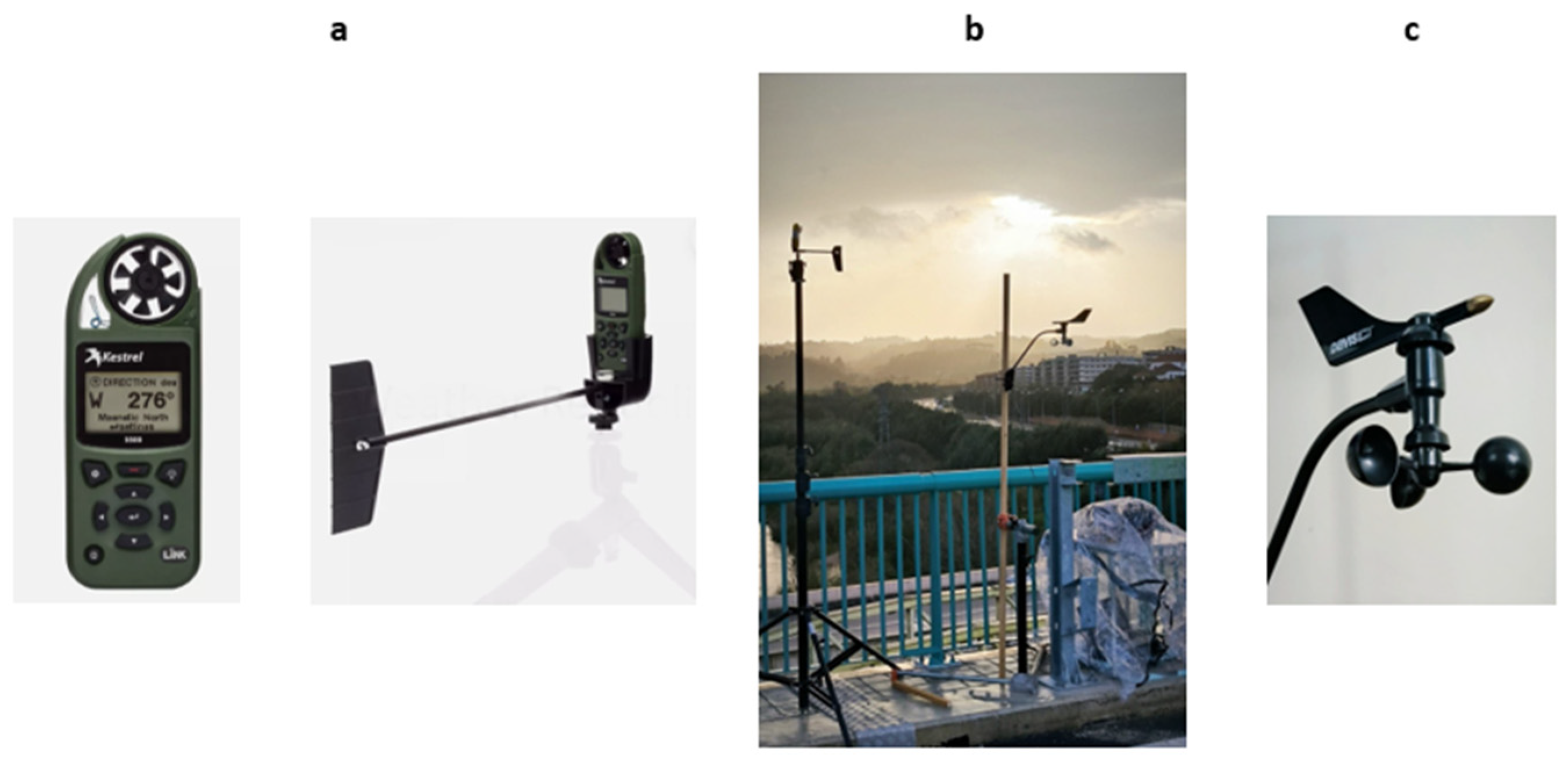 (a) Kestrel 5500 weather station; (b) instrumentation installed in the test zone for wind speed and wind direction measurements; (c) Davis Vantage Pro weather wind measuring probes.
