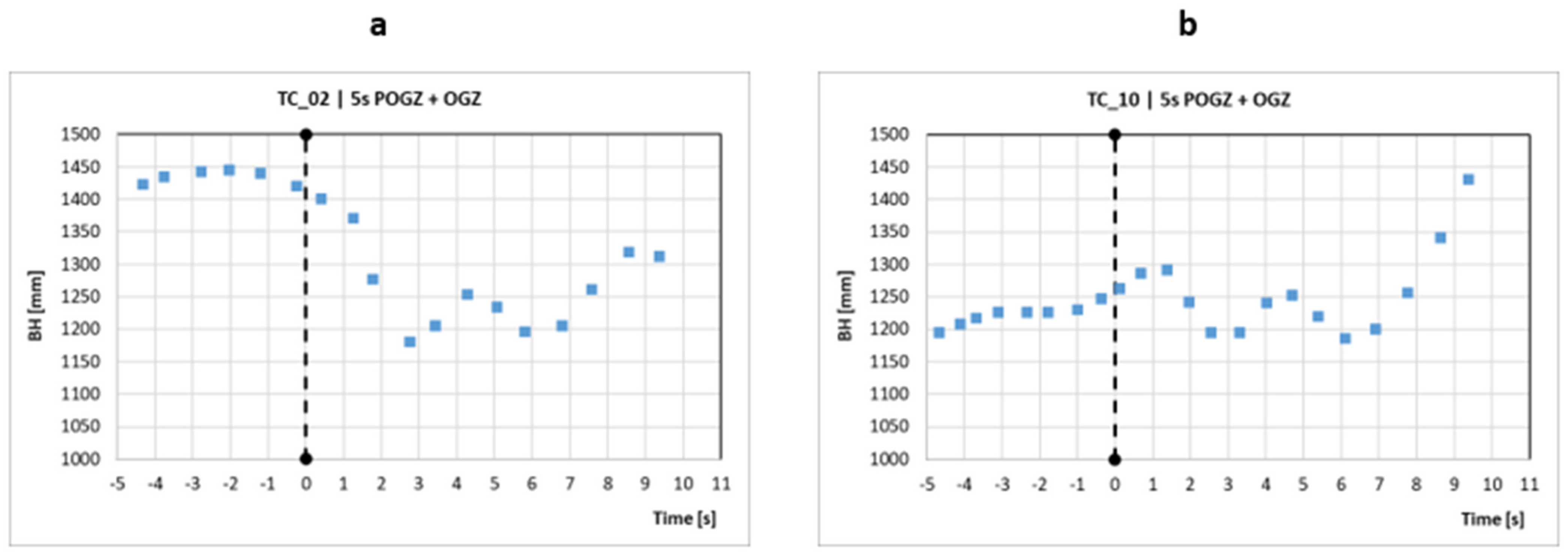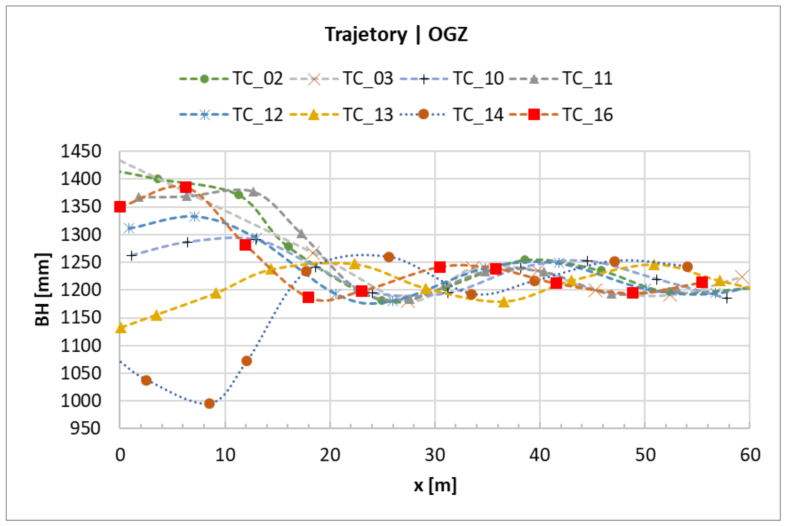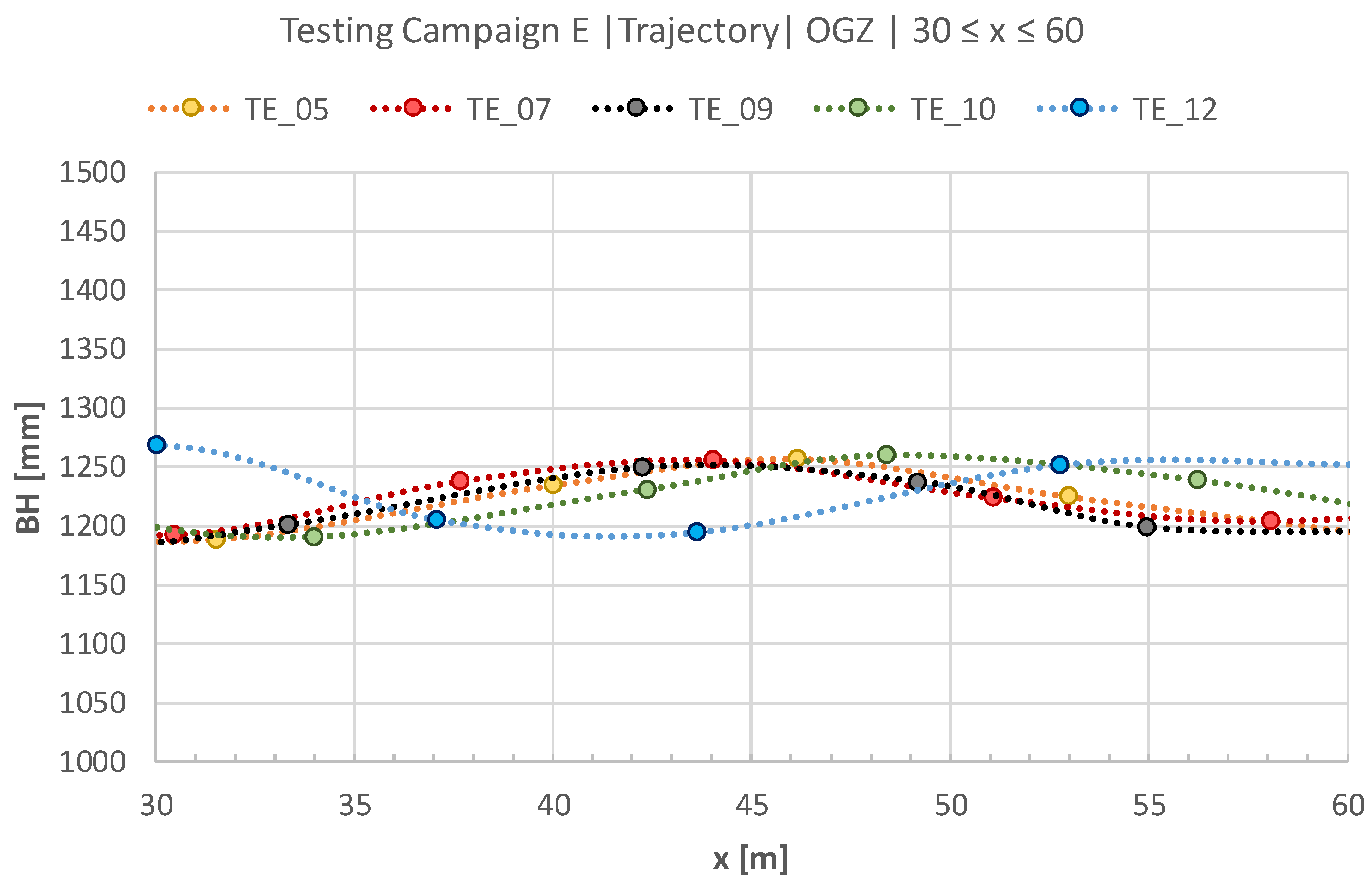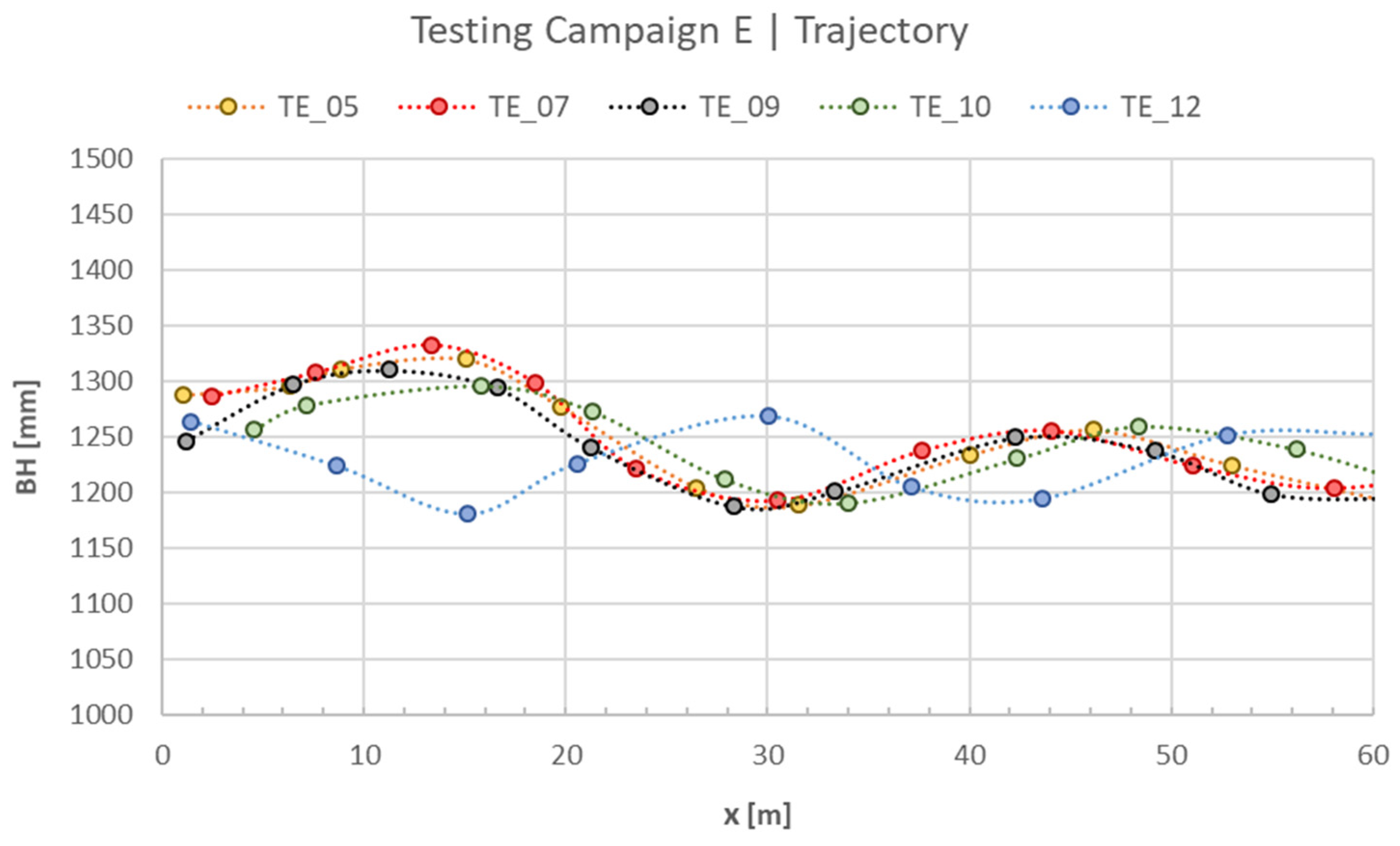 Trajectory in selected E tests, based on the longitudinal evolution of BH within the OGZ (VS ≈ 30 km/h), following the initial stabilisation zone (30 ≤ x ≤ 60 m).