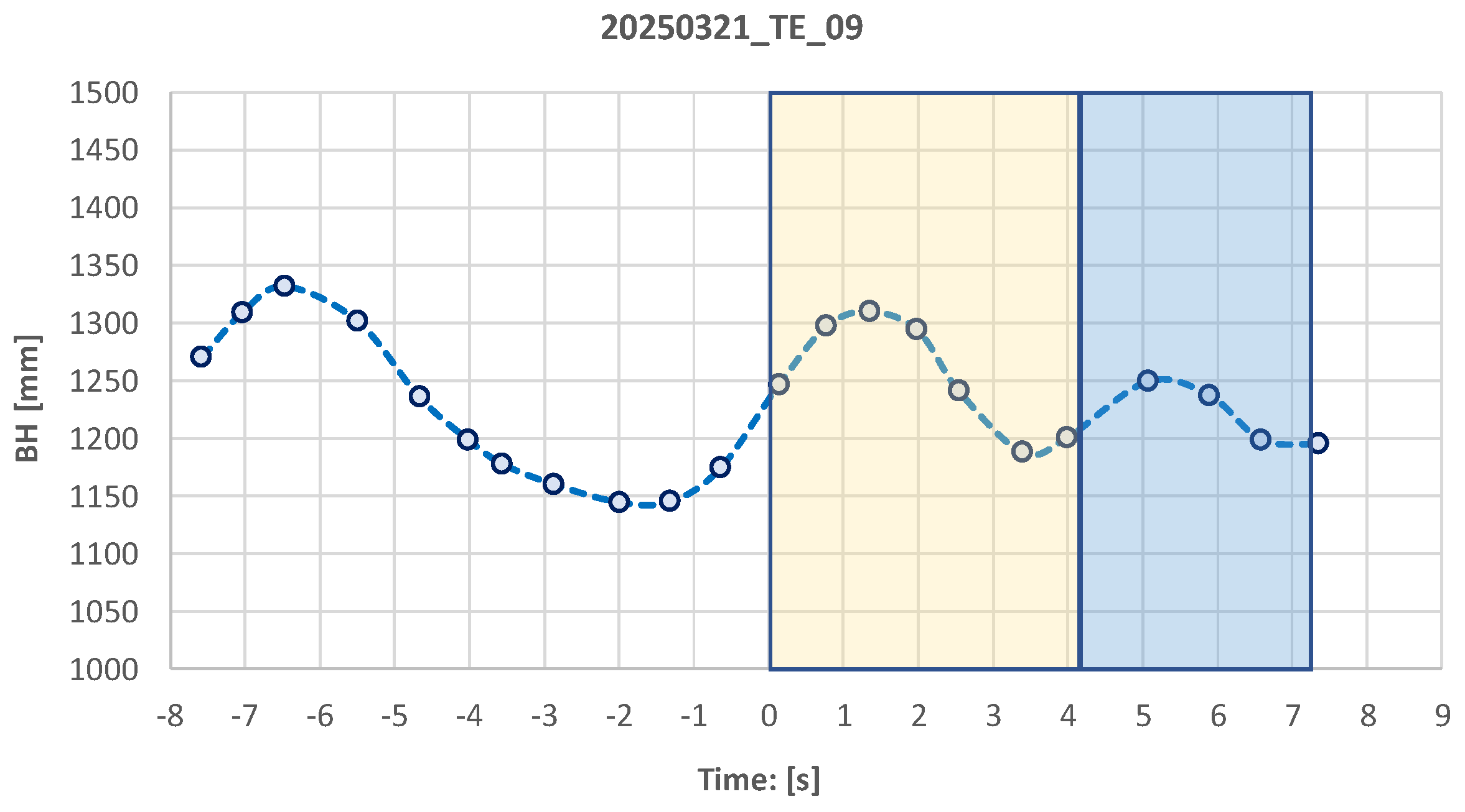 Time evolution of BH during test TE09, showing three phases: (i) upstream of the OGZ (time < 0 s); (ii) adjustment phase (0 ≤ time <4 s—highlighted in yellow shade); and (iii) stabilised phase (highlighted in blue shade).